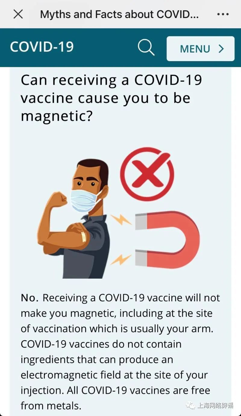 早在2020年4月,境外也流传过类似谣言,称“在接种新冠疫苗后身体产生了磁性”。当时,美国疾病预防控制中心(CDC)就在官网上辟谣:所有COVID-19疫苗都不含可在注射部位产生电磁场的成分,也不含金属,接种COVID-19疫苗不会让身体产生磁性。