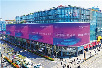 杭州市上城区延安路亚洲最大LED大屏“西湖天幕”亮相杭州。栩栩如生的吉祥物“江南忆”组合、亚运宣传海报和动画视频等内容营造出浓厚的亚运氛围,令市民及游客大饱眼福。洪 亮摄(中经视觉)