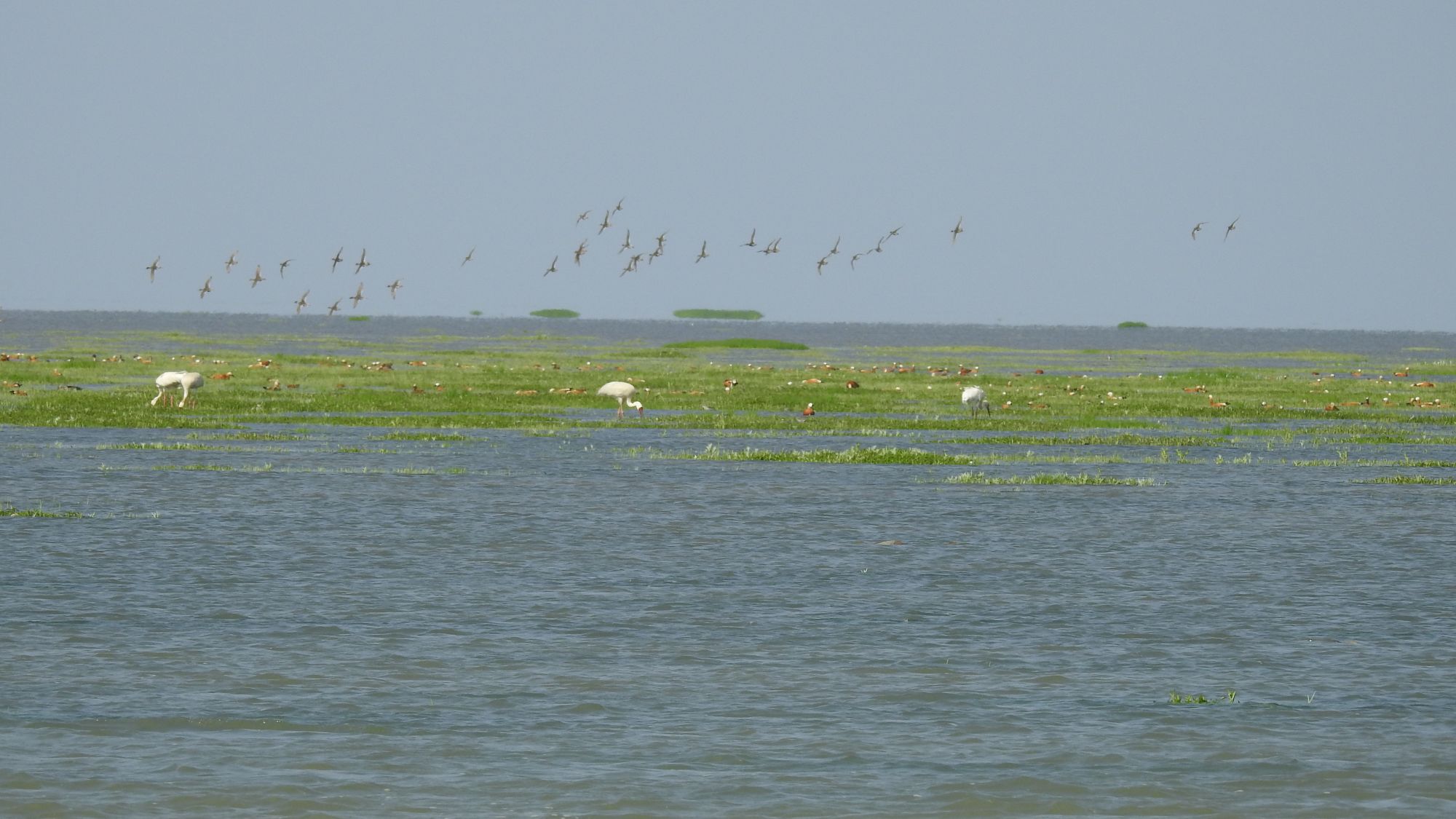 李跃说:“由于食物充沛,这些候鸟也正处于积蓄体能阶段,等湖区水位上涨和气温回升,它们就要迁飞了。”