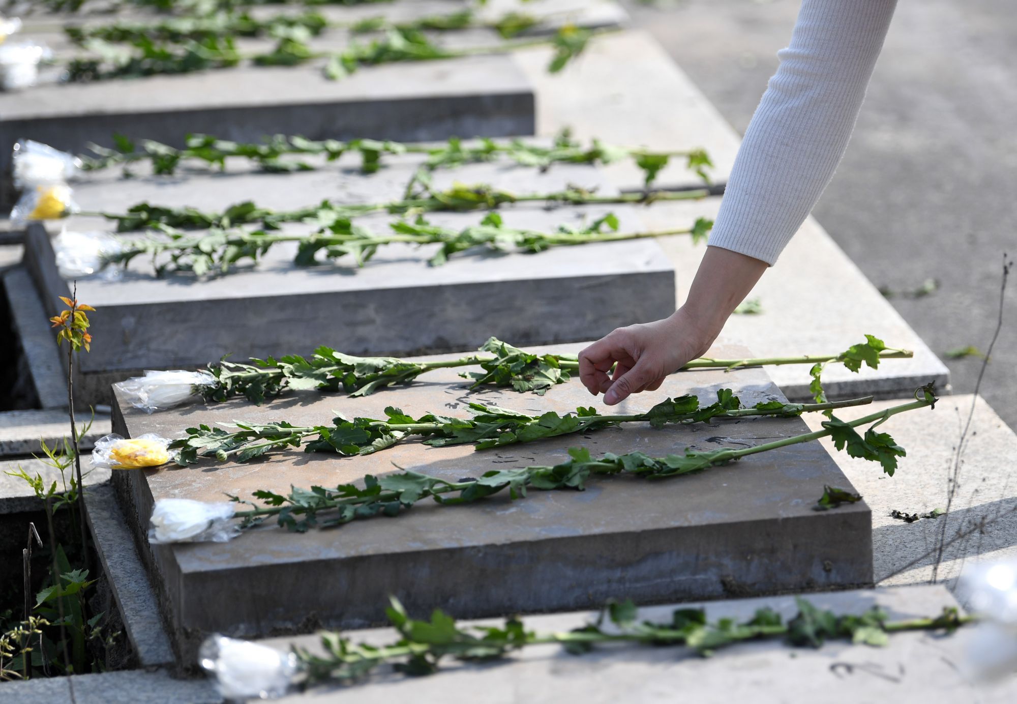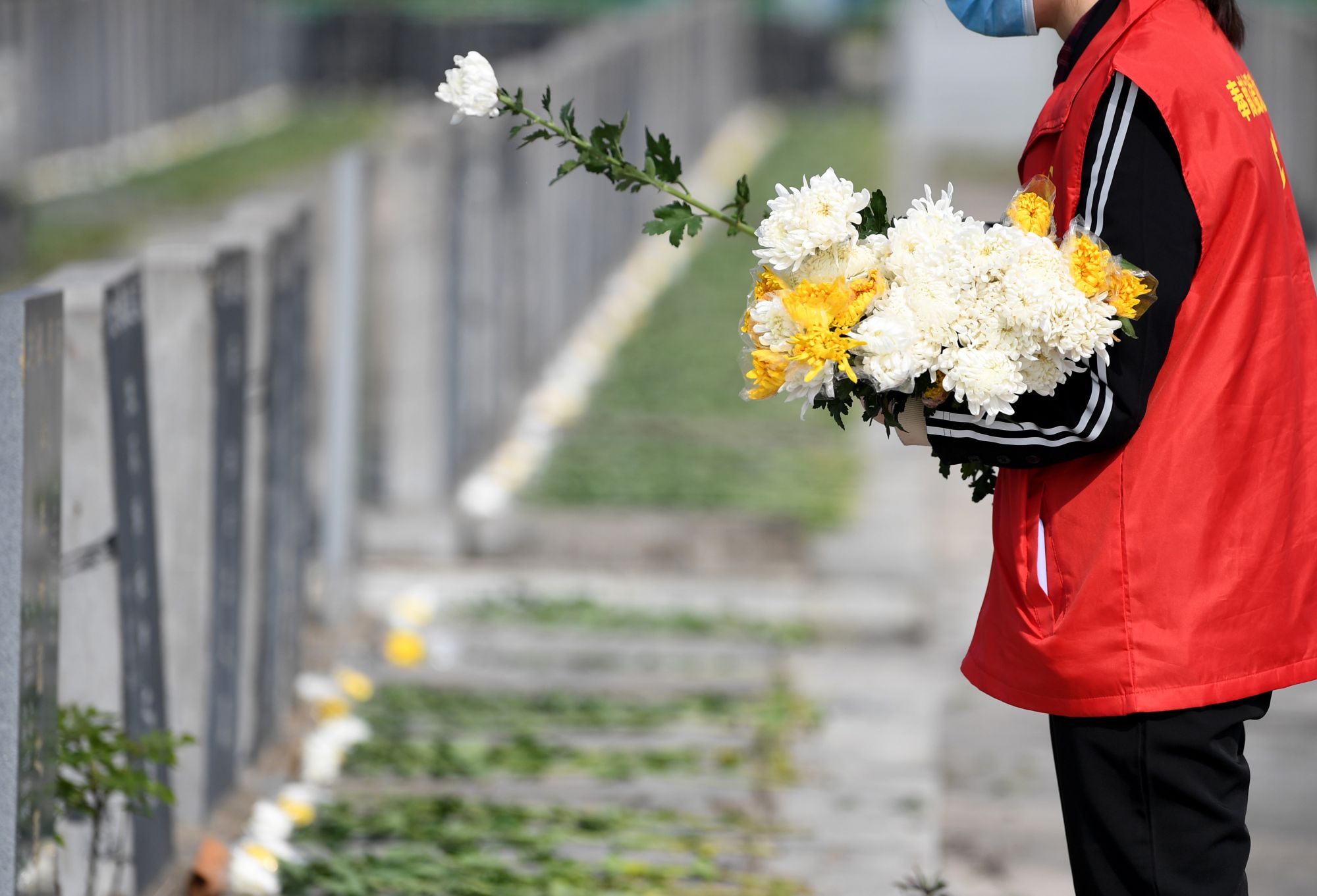 ↑4月2日,合肥市肥西县花岗镇志愿者在辖区公墓开展代祭扫。新华社发(马家贵 摄)