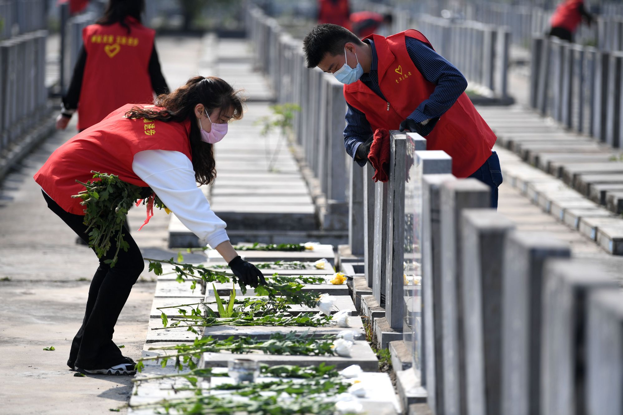 ↑4月2日,合肥市肥西县花岗镇志愿者在辖区公墓开展代祭扫。新华社记者 刘军喜 摄