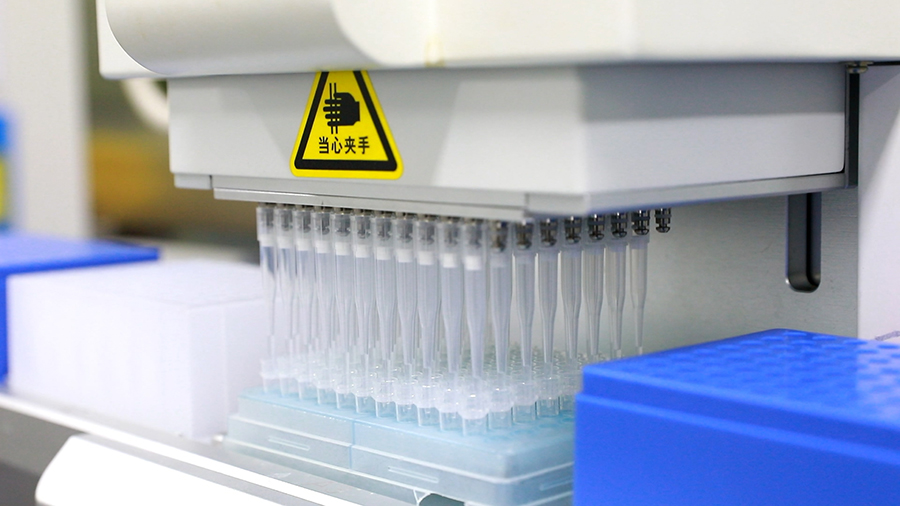在长沙市中医院(长沙市第八医院)检验科,我们看到核酸检测需要手工完成的“加样”,检验人员在生物安全柜内一管一管地拧开样本的螺旋盖,手工吸取后加入核酸提取板孔中,再拧紧螺旋盖,将样本放回原处。一天下来每人要做近700份样本“加样”,意味着要单手重复近1400次拧盖动作。