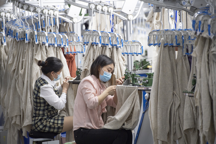 4月6日,在福建泉州南安市的一家电脑针织有限公司,工人在加工外贸针织衫。新华社发(王毅 摄)