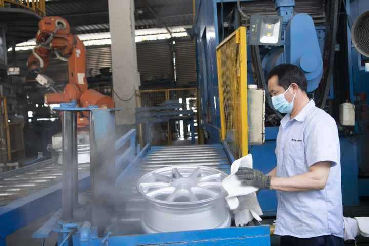 4月6日,在福建泉州南安市的一家铝业发展有限公司,工人在加工出口汽车铝合金轮毂。新华社发(王毅 摄)