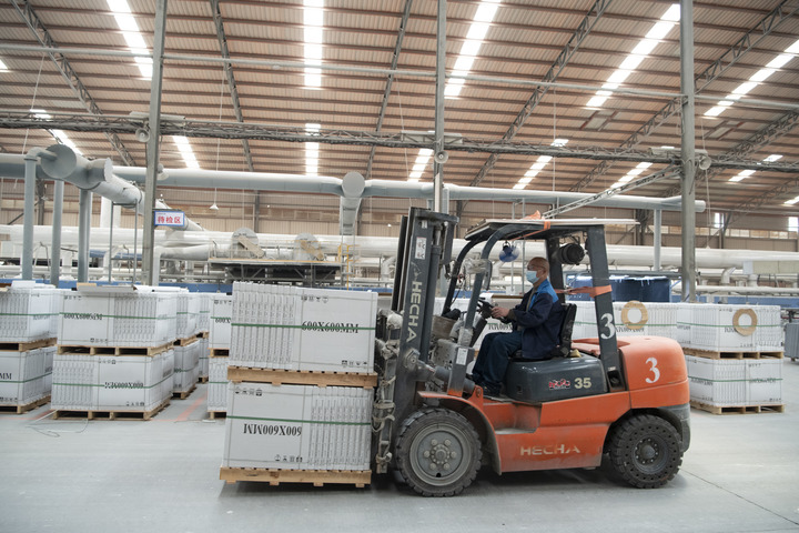 4月6日,在福建泉州南安市的一家建材有限公司,工人在装运出口瓷砖产品。
