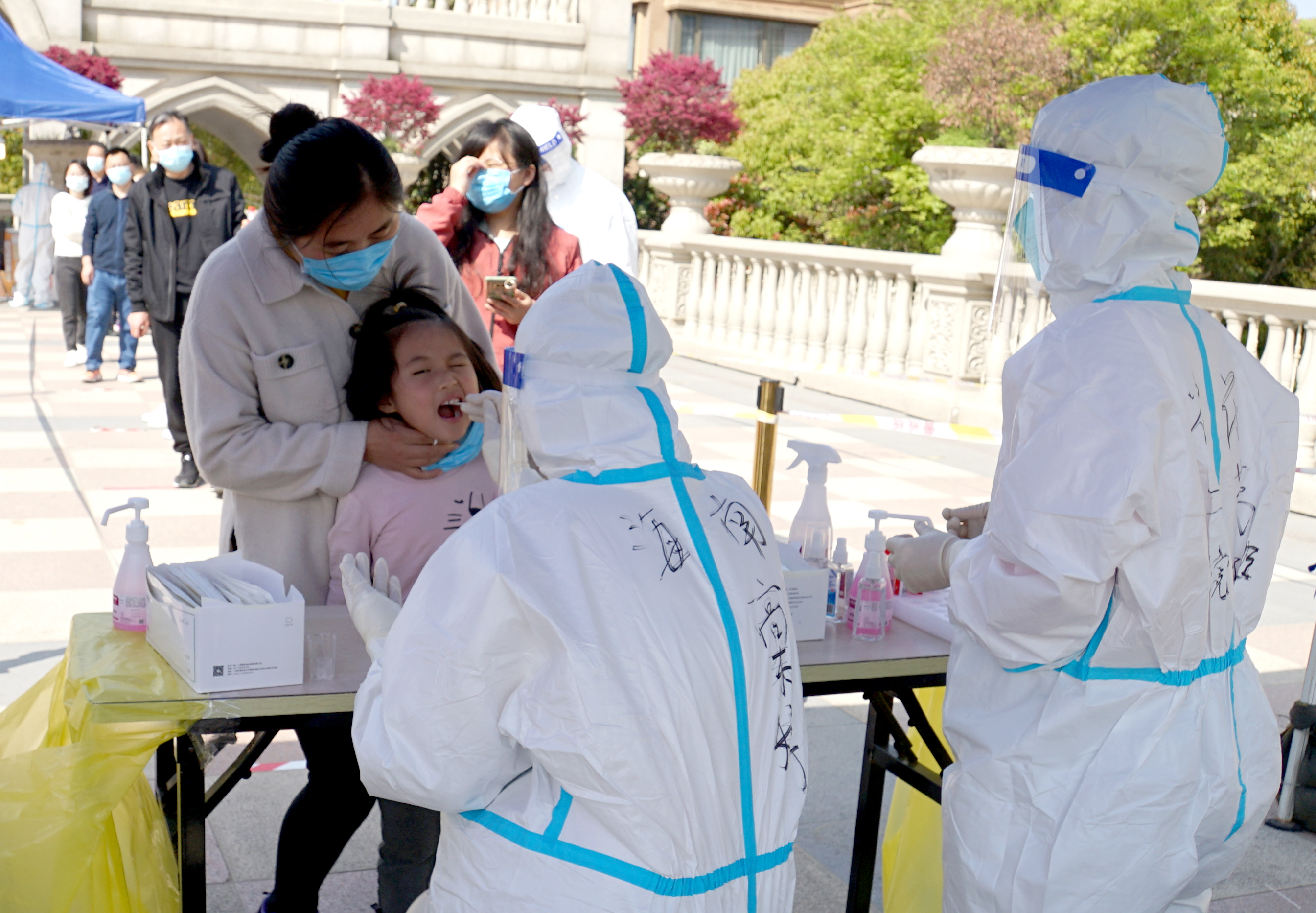 4月6日,在上海嘉定区南翔镇一小区内,来自海南的援沪医务人员为居民进行核酸检测。新华社记者 王淑娟 摄