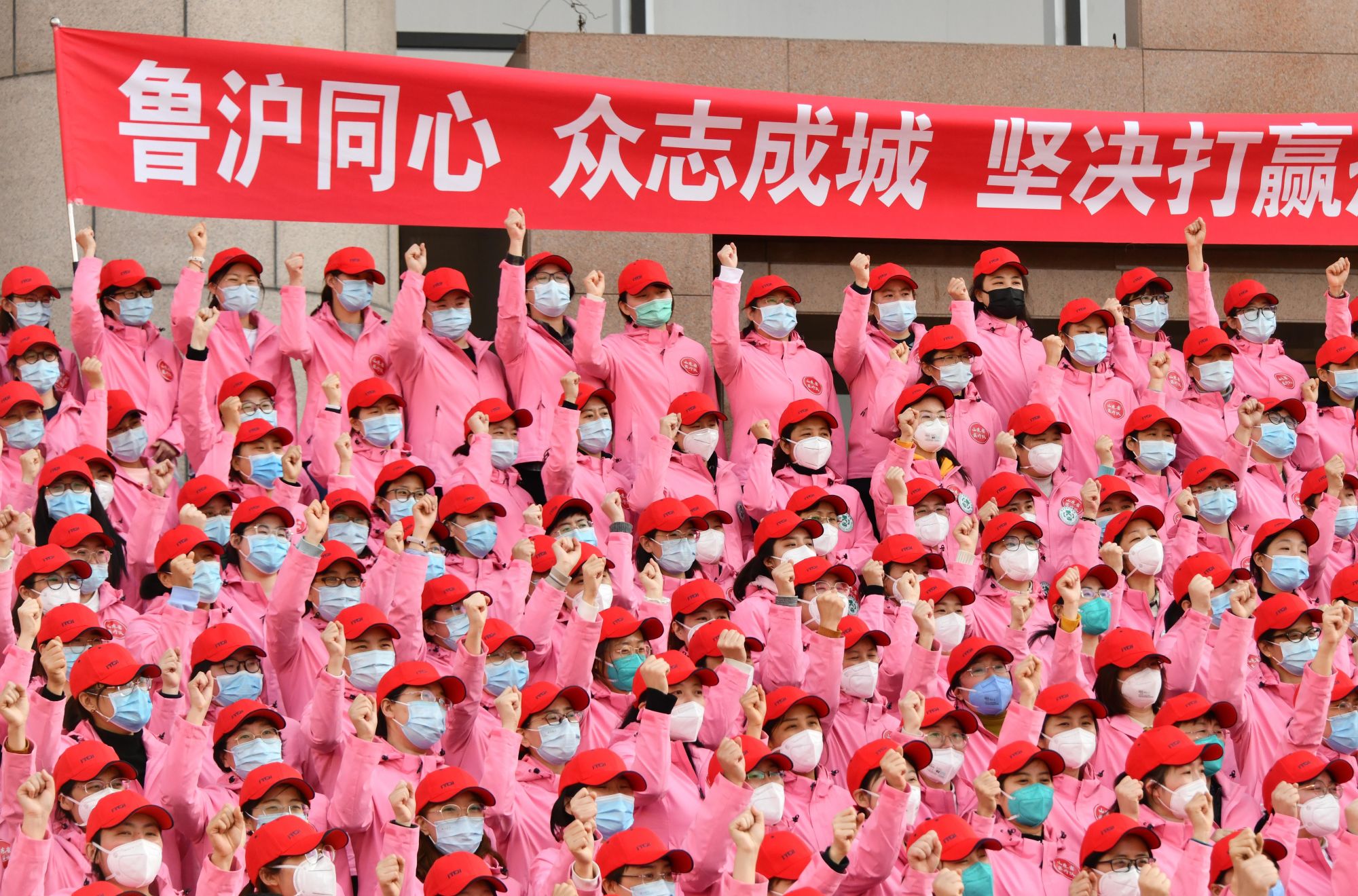 4月3日,第一批山东省援沪医疗队队员在济南市参加出征仪式。新华社记者 徐速绘 摄