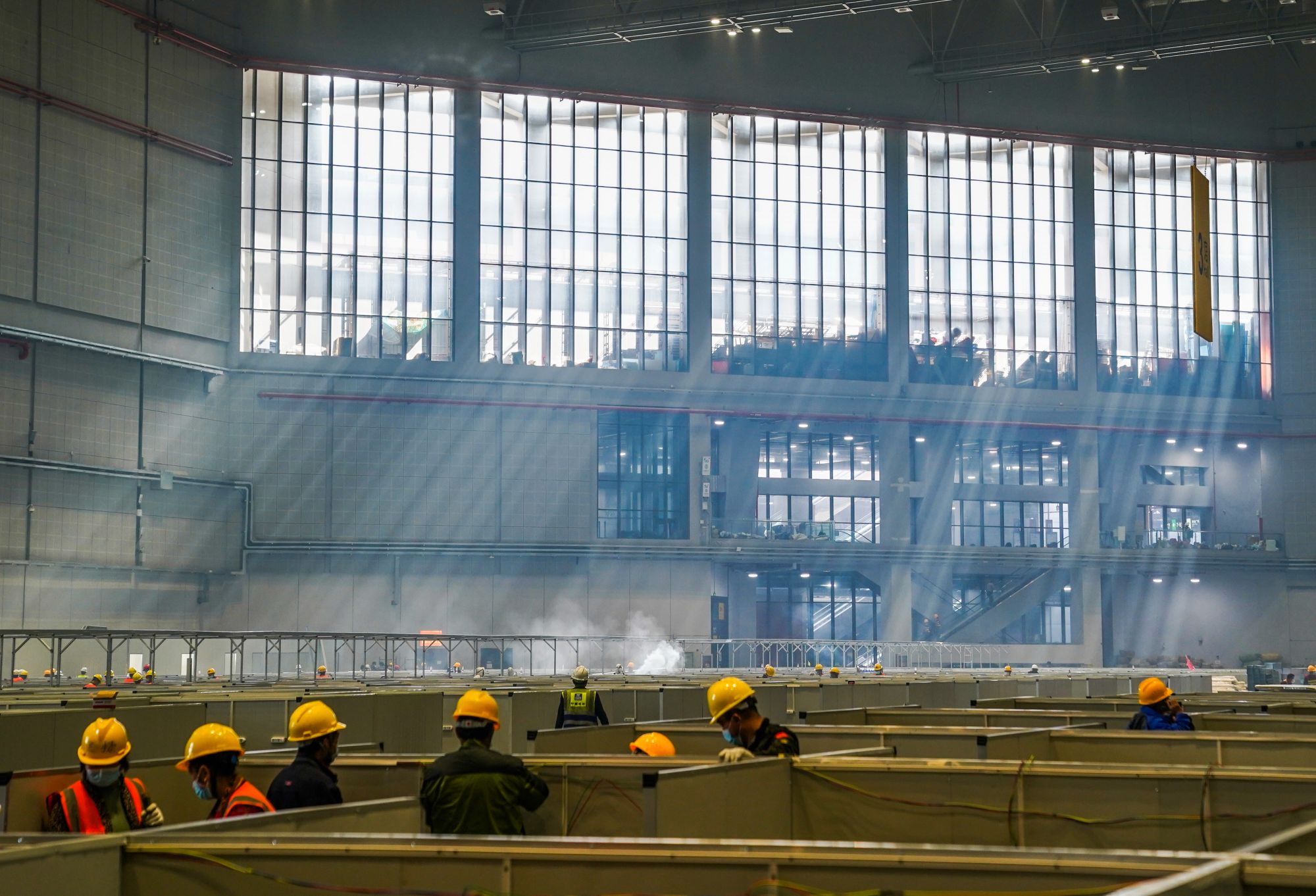 国家会展中心(上海)展馆内,彻夜灯火通明。这里正在建设上海最大的方舱医院,建成后将提供超过4万张床位。