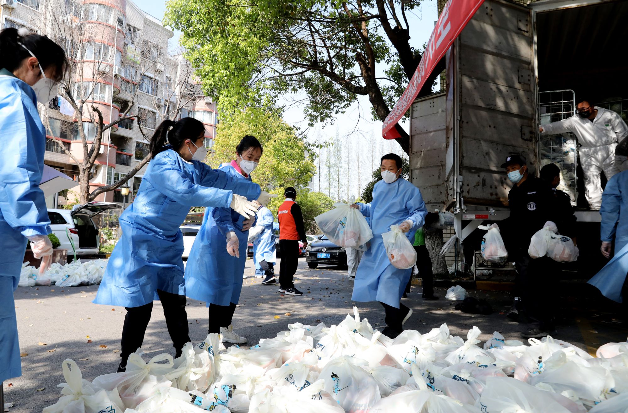 4月3日,在上海闵行区七宝镇一个封控居民小区内,社区志愿者摆放清点刚卸下车的生活物资。新华社记者 方喆 摄