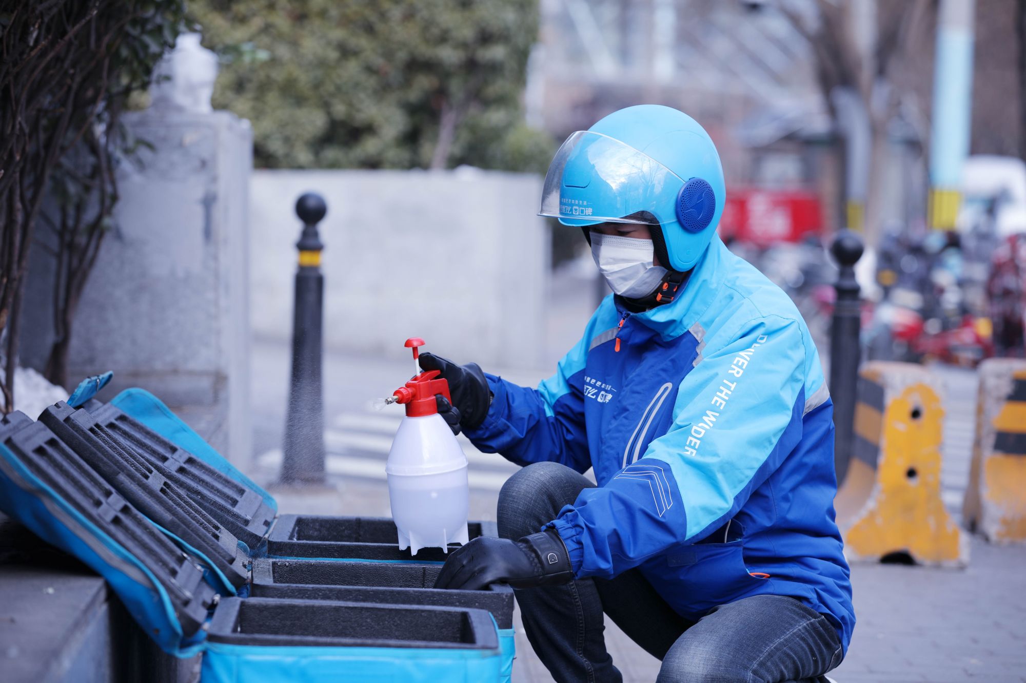 一名饿了么骑手正在为外卖箱消毒。受访对象供图