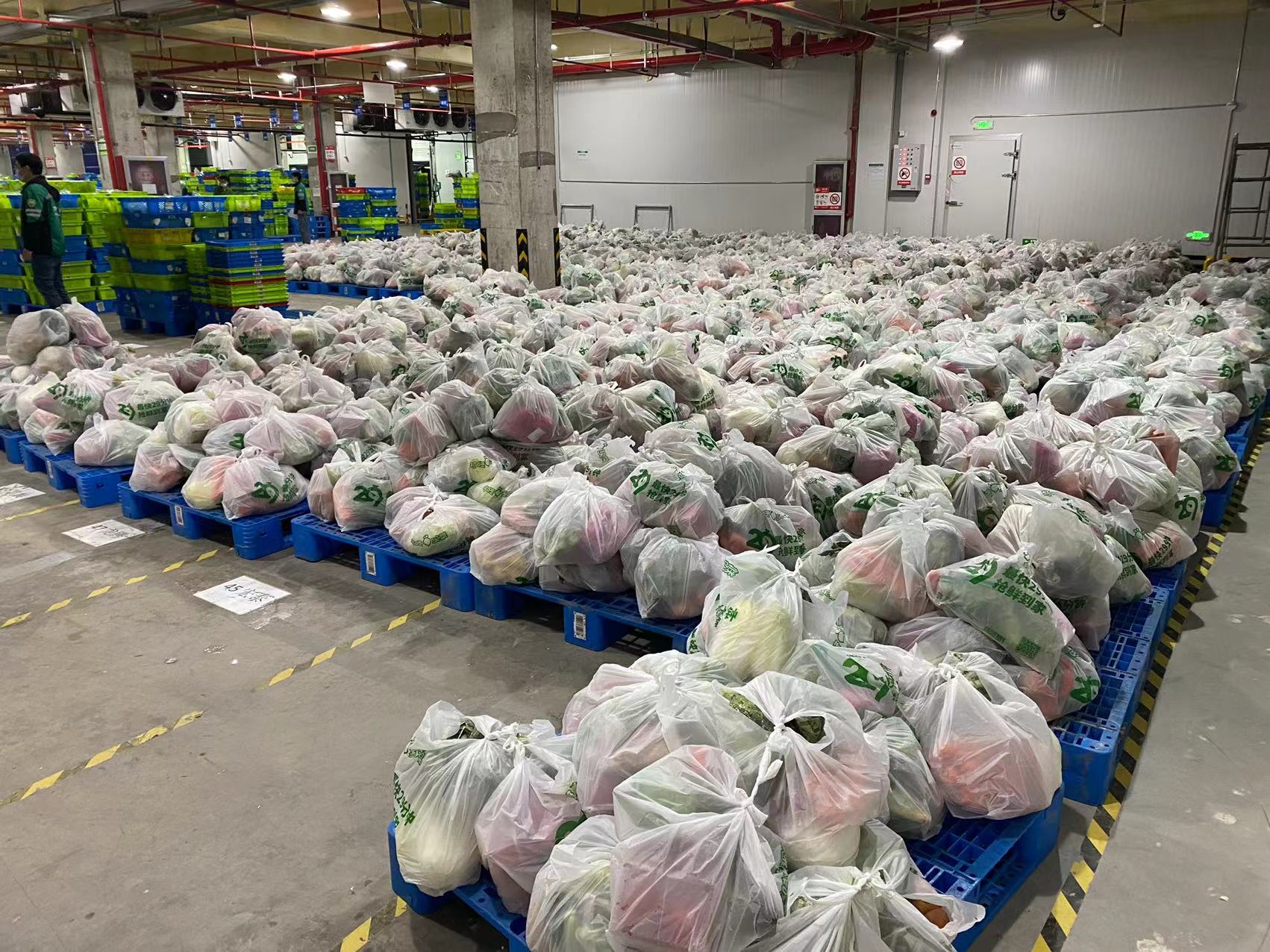 叮咚买菜杭州余杭城市分选中心内,一批批蔬果等物资正等着运往上海。受访对象供图