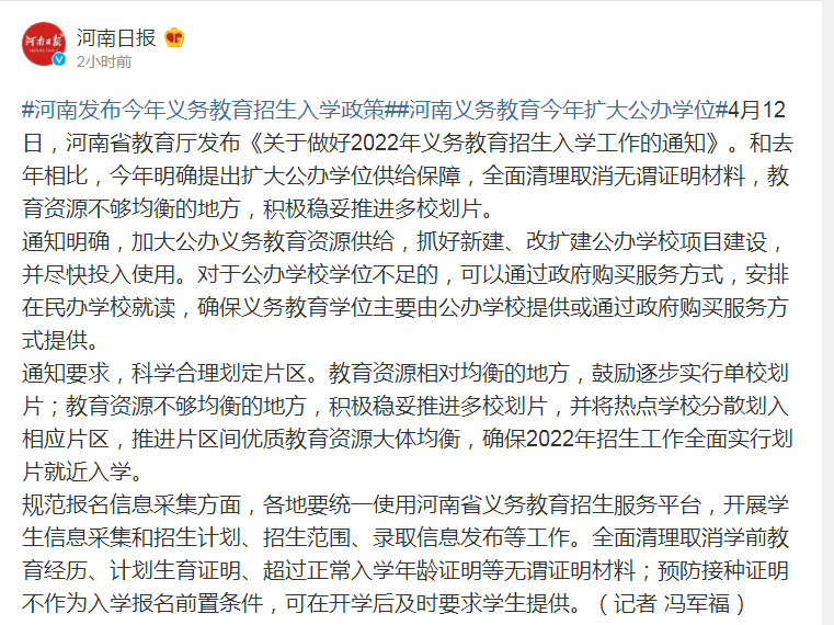 #河南发布今年义务教育招生入学政策##河南义务教育今年扩大公办学位#4月12日,河南省教育厅发布《关于做好2022年义务教育招生入学工作的通知》。和去年相比,今年明确提出扩大公办学位供给保障,全面清理取消无谓证明材料,教育资源不够均衡的地方,积极稳妥推进多校划片。