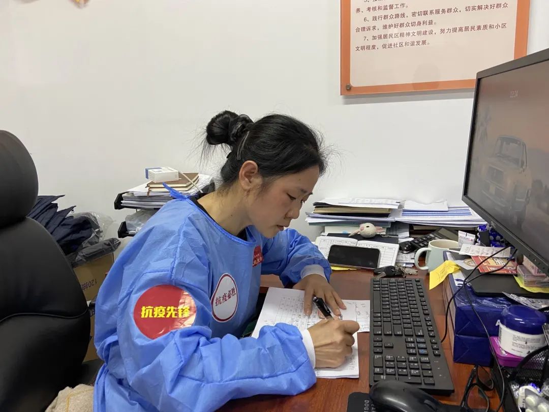 “这样的硬仗我们打了一场又一场,这段时间同事们都很忙、很累,我们的副主任朱恒有一次接电话,接着接着就趴在桌子上睡着了,本来就很瘦的他最近又瘦了8斤;我们的副主任李芳,因为丈夫也在抗疫一线,只得带着孩子住在居委会,女儿在一个长沙发上睡,她自己将两个沙发椅拼在一起睡,真的很苦。”