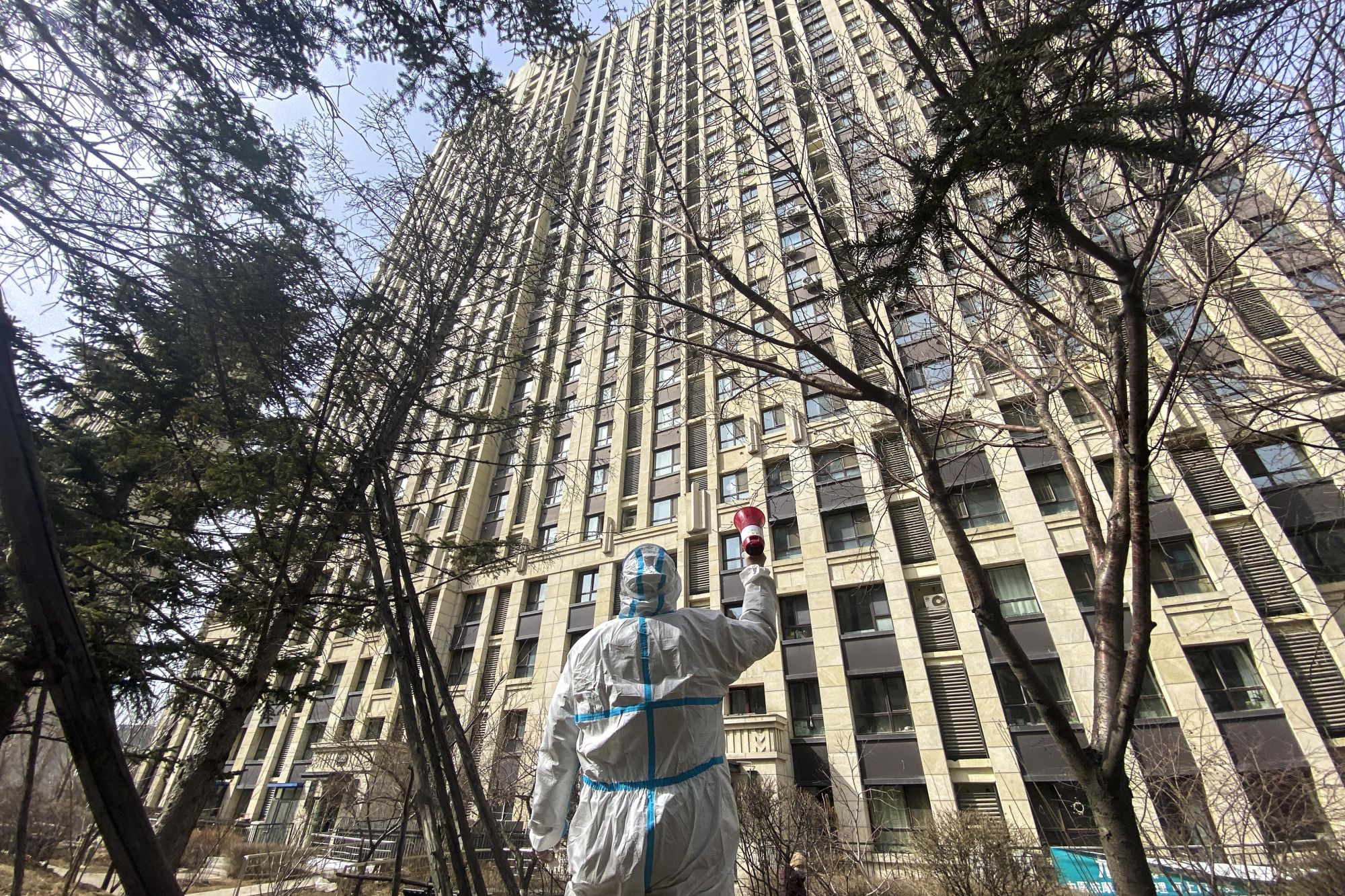 在吉林省长春市一处管控小区内,防疫工作人员用喇叭提醒居民下楼接受核酸采样(3月25日摄)。新华社记者 许畅 摄