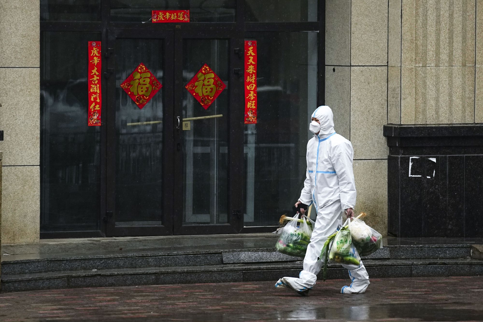 在吉林省长春市一处管控小区,社区工作人员为居民配送生活物资(3月29日摄)。新华社发