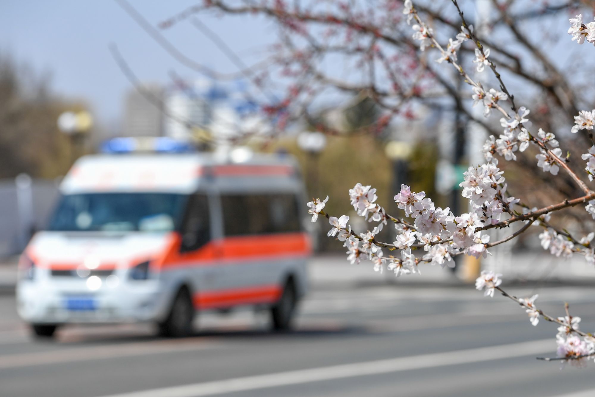 4月14日,一辆救护车在吉林省吉林市松江东路上驶过,路边桃花已经盛开。新华社记者 张楠 摄