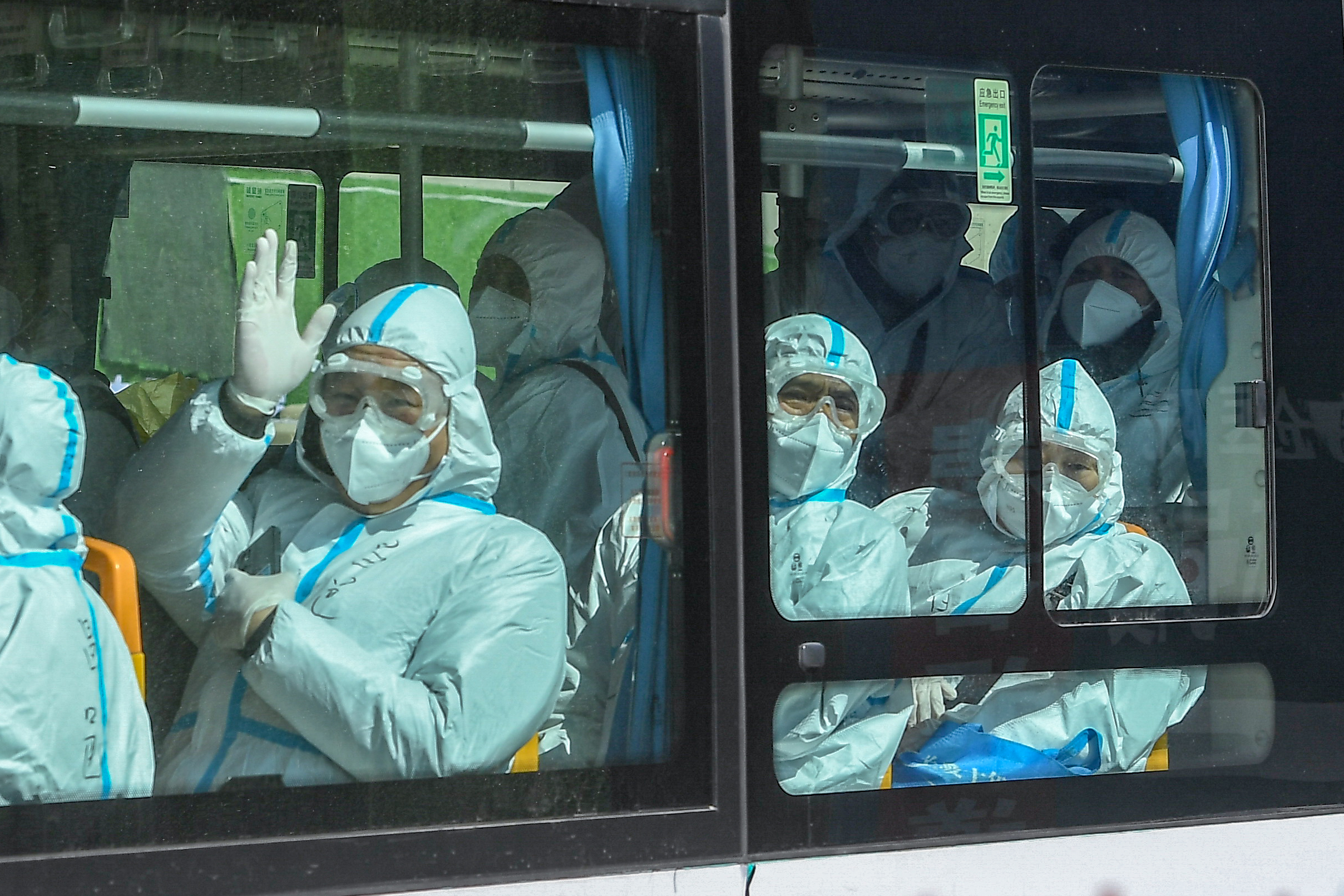 4月6日,在吉林省吉林市高新北区方舱医院,出院患者朝车外招手致意。新华社记者 张楠 摄