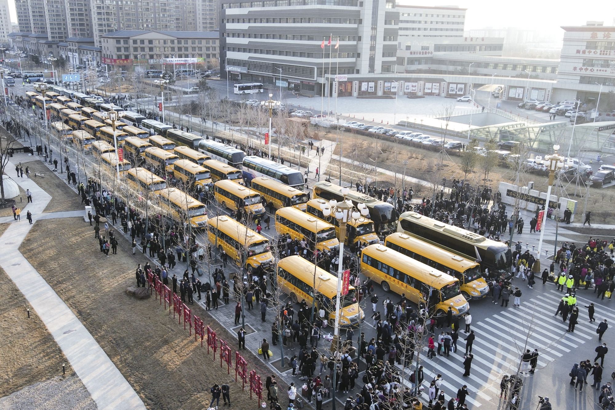 吉林省梅河口市对口支援人员在梅河口市内集结,准备赶赴长春(4月3日摄,无人机照片)。新华社发