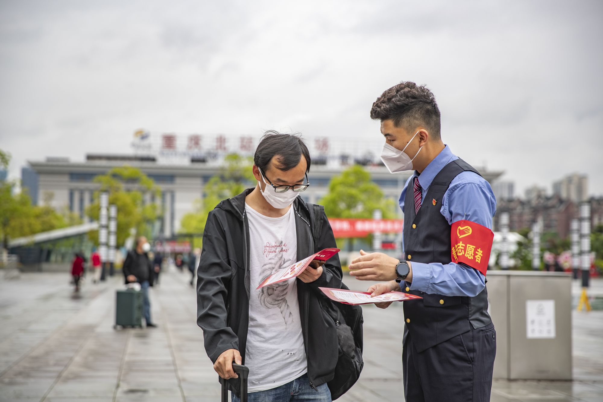 4月14日,在重庆北站北广场,中国铁路成都局集团有限公司重庆客运段青年职工志愿者为旅客宣讲防范化解危害国家安全行为的小知识。新华社记者 黄伟 摄