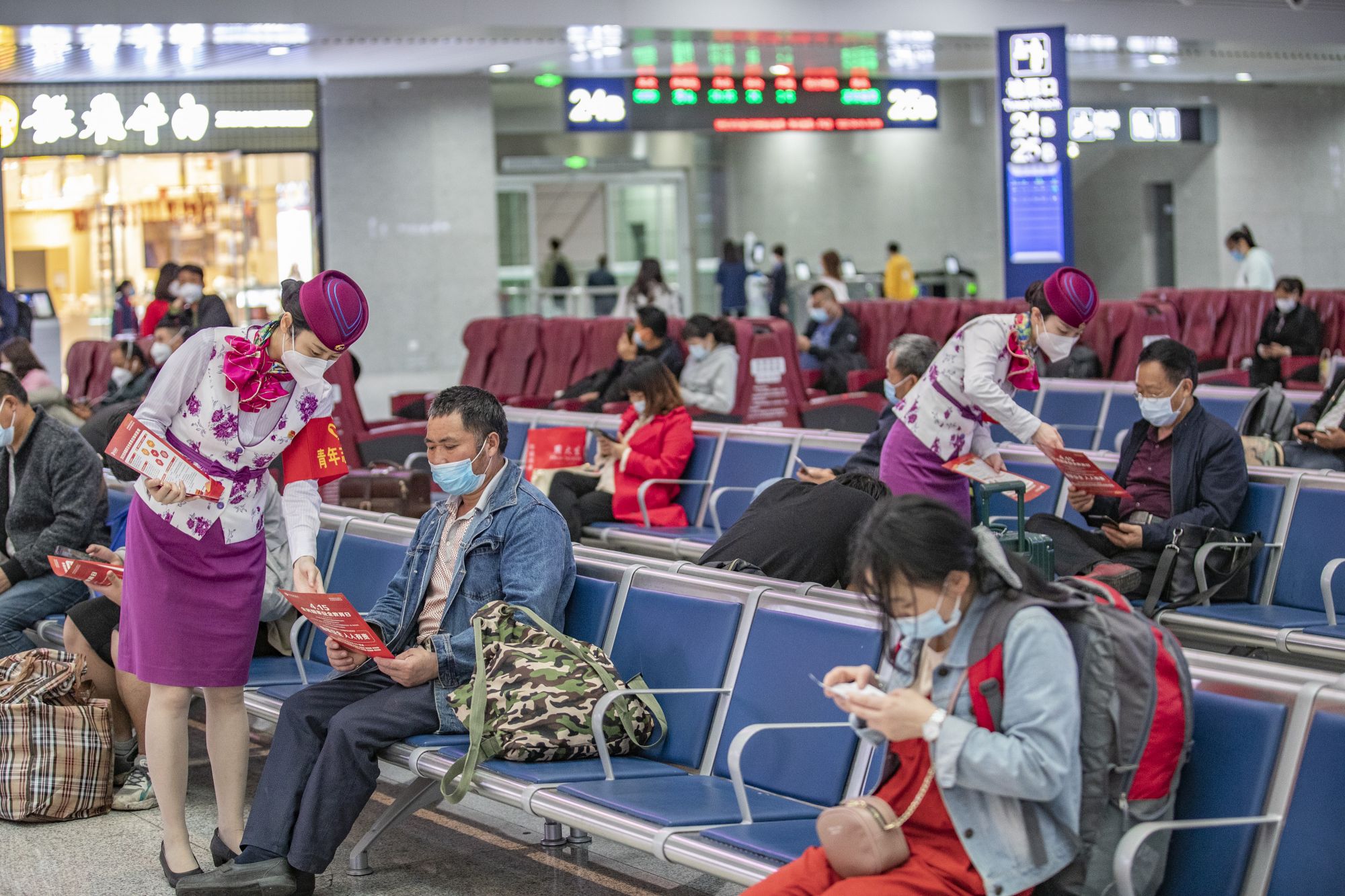 4月14日,在重庆北站候车大厅,中国铁路成都局集团有限公司重庆客运段青年职工志愿者为旅客发放国家安全日宣传单。新华社记者 黄伟 摄