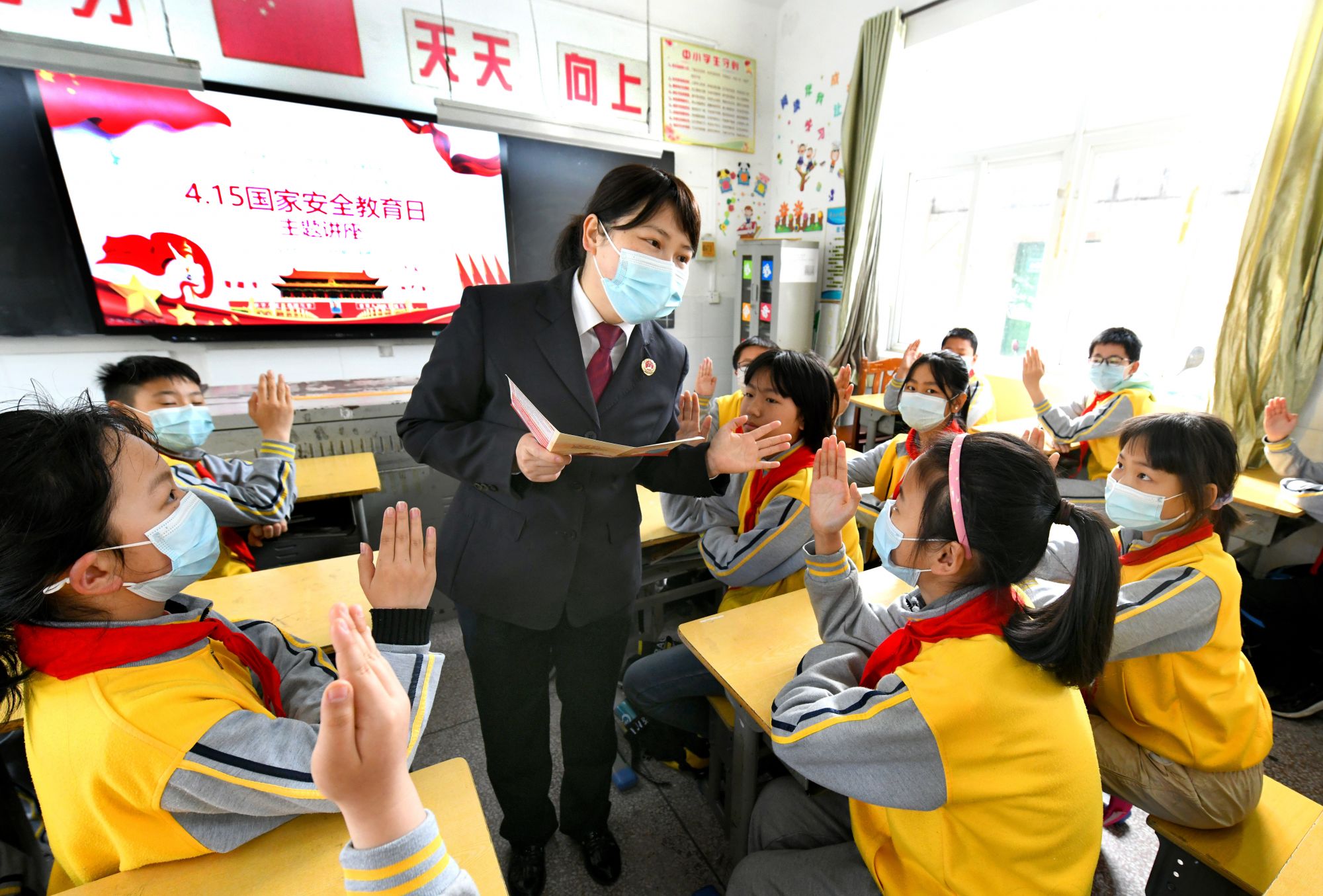 4月14日,在河南省焦作市温县第三实验小学,法官为学生进行国家安全教育。新华社发(徐宏星 摄)