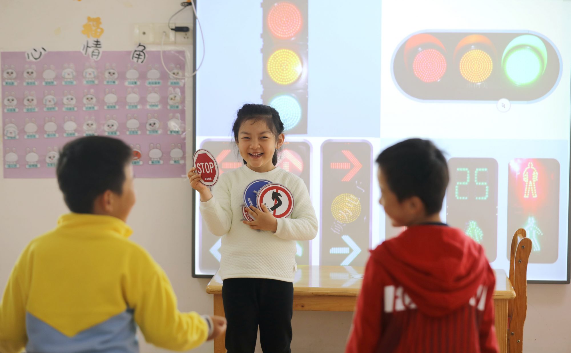 4月14日,在安徽省合肥市蜀山区琥珀街道北苑村社区辖区幼儿园,小朋友通过互动游戏的方式,学习了解交通安全知识。新华社发(陈三虎 摄)