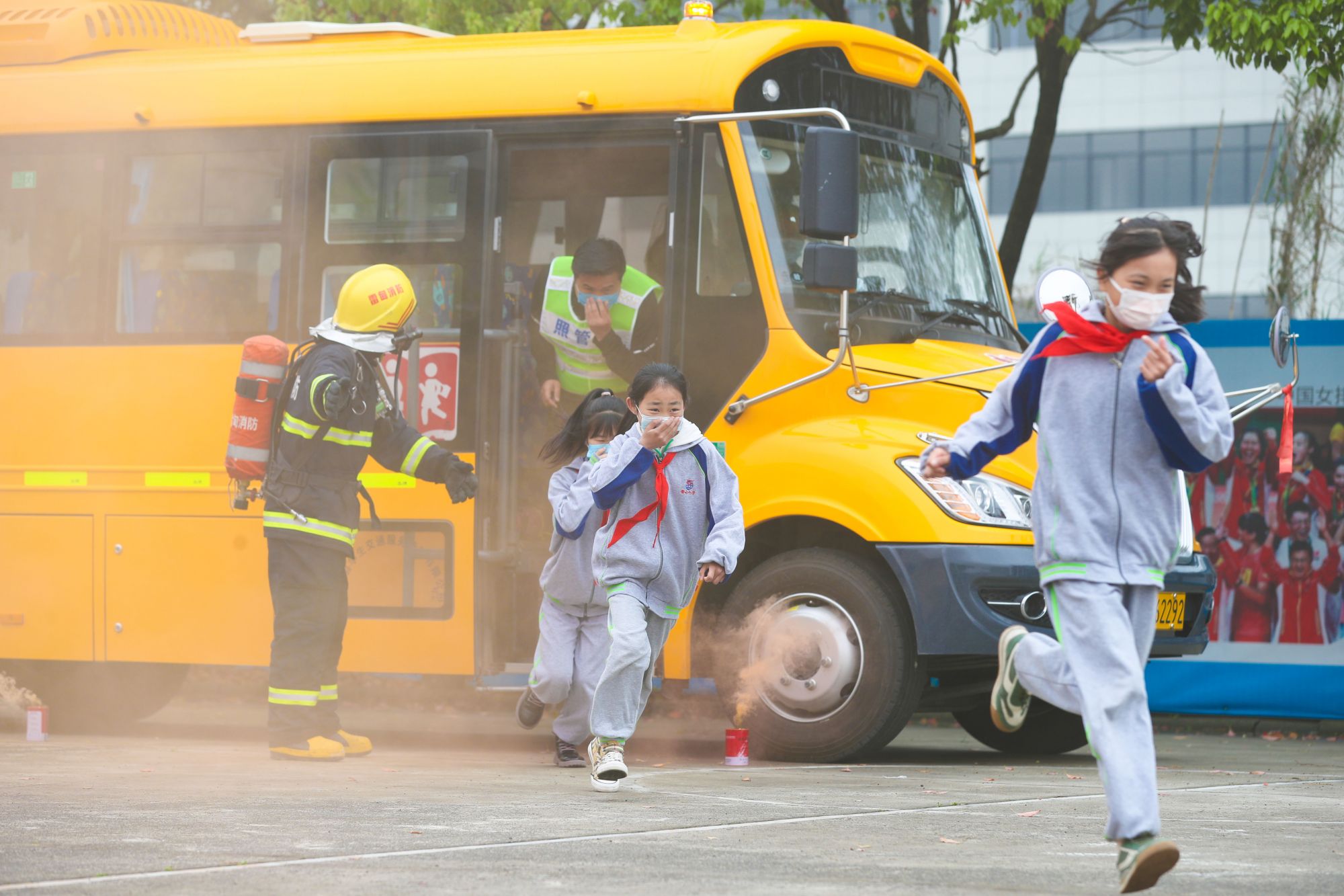 4月14日,在浙江省湖州市德清县雷甸镇中心小学通航校区,学生们在消防队员指导下进行校车应急逃生演练。新华社发(王正 摄)