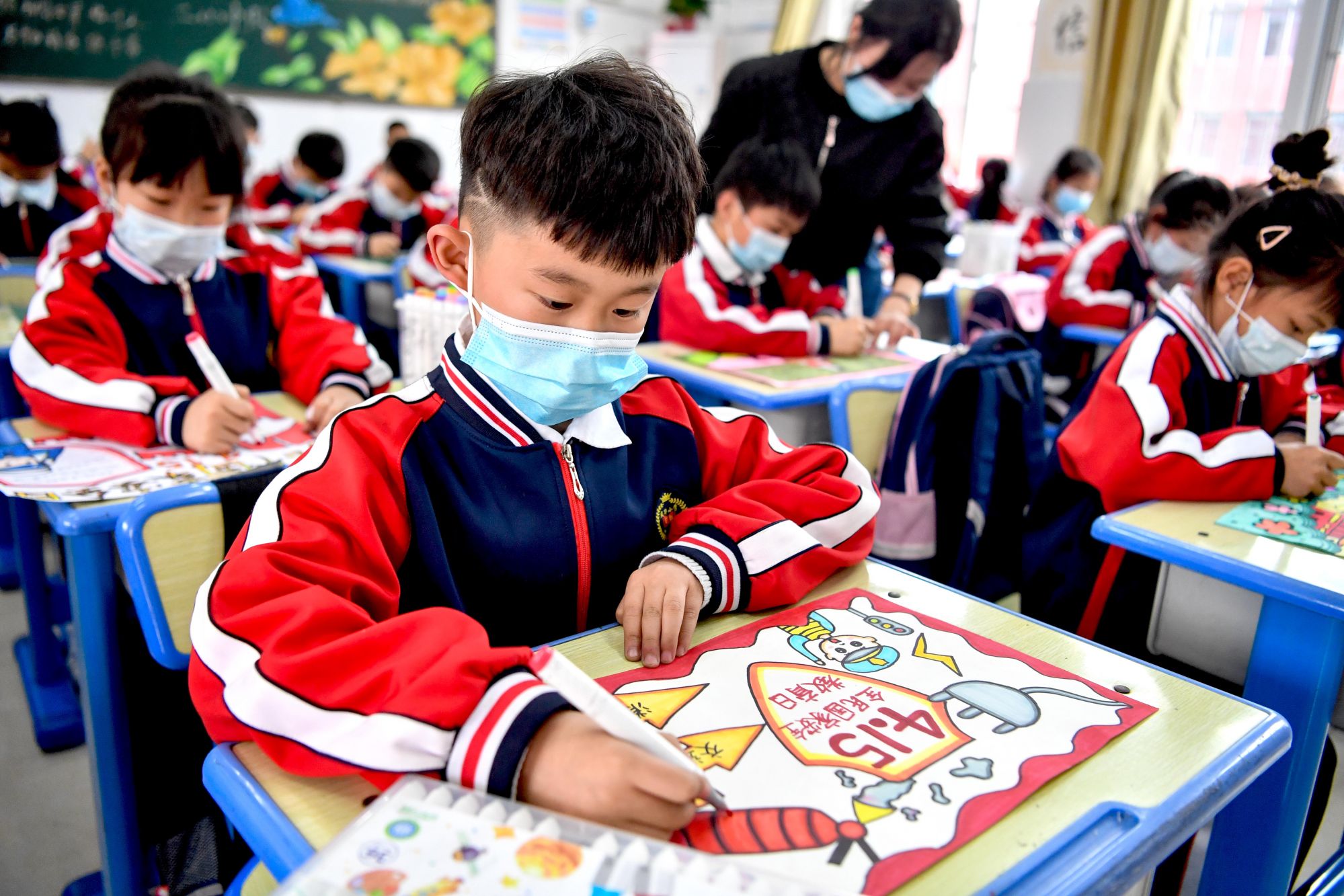 4月14日,在安徽省亳州市风华桐乡路小学,学生参加“全民国家安全教育日”主题绘画活动。新华社发(刘勤利 摄)