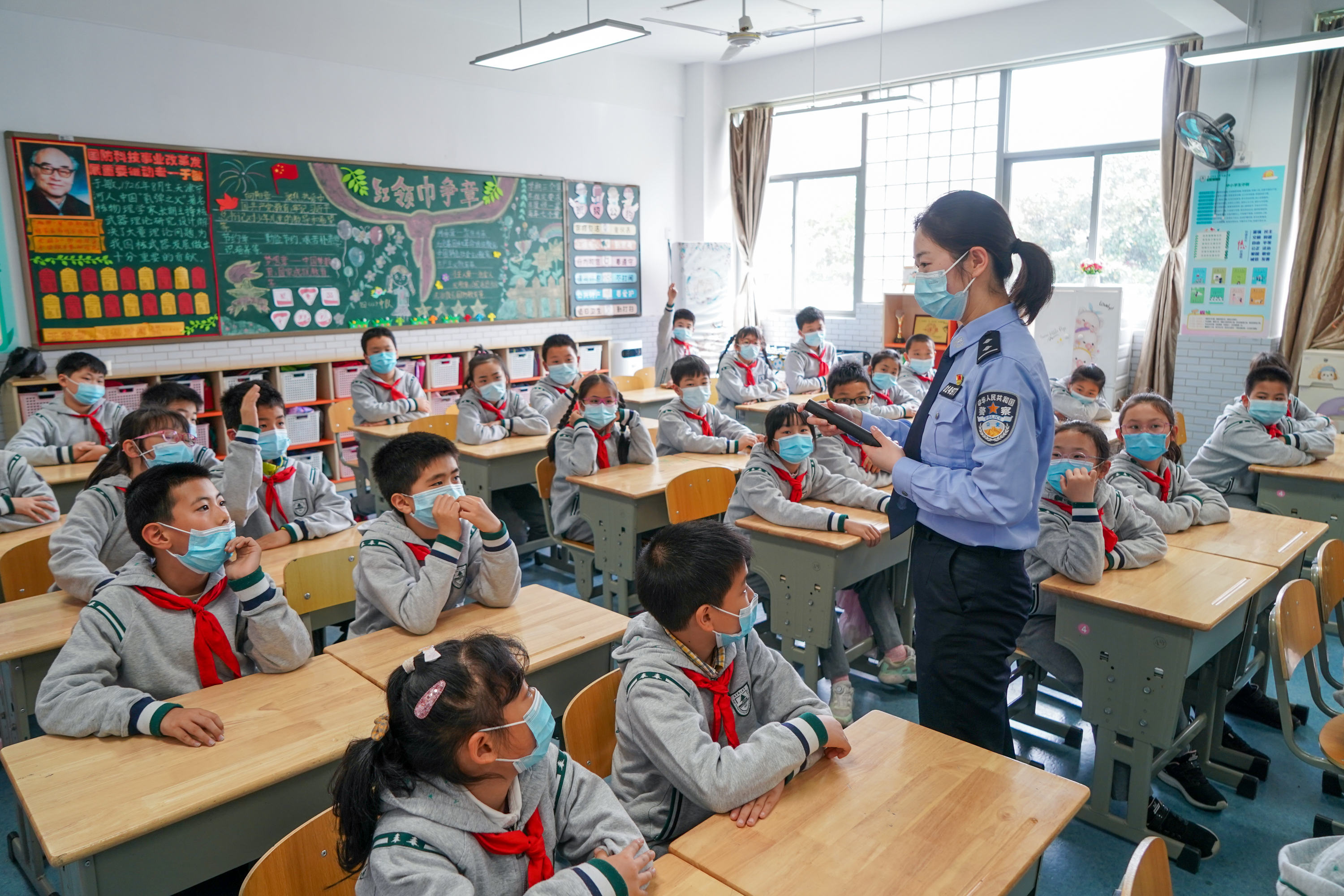 4月14日,在河北省邢台市第二十八中学,民警对学生进行安全教育。新华社发(张驰 摄)