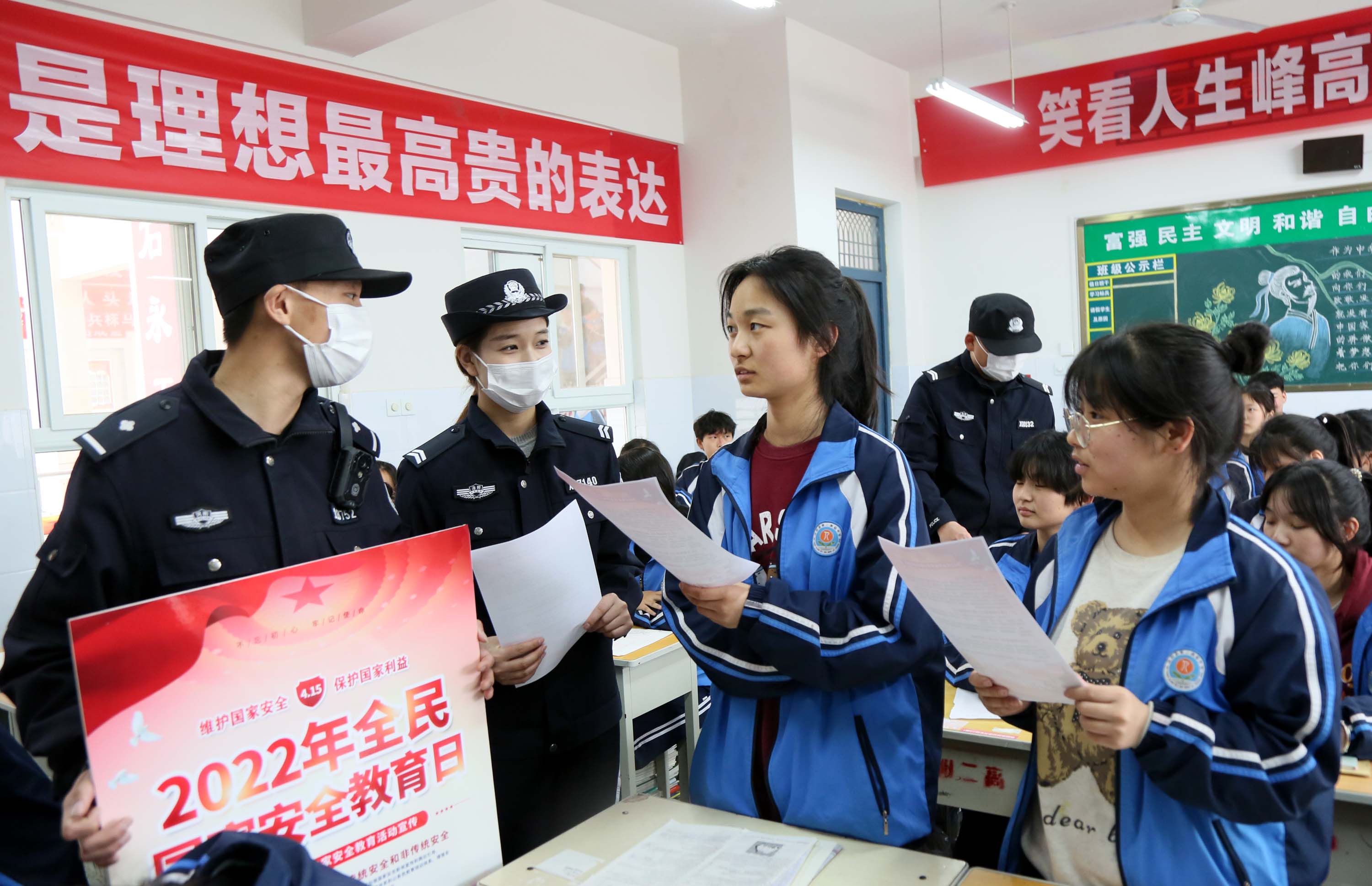 4月14日,河南省洛阳市汝阳县公安局城关派出所民警向学生宣传国家安全相关知识。新华社发(康红军 摄)