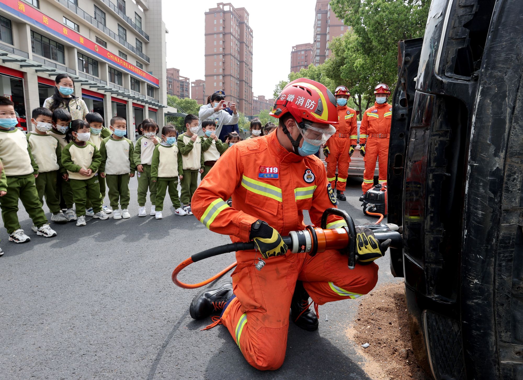 4月14日,在安徽省全椒县消防救援大队,消防员向小朋友们演示交通事故救援。新华社发(沈果 摄)