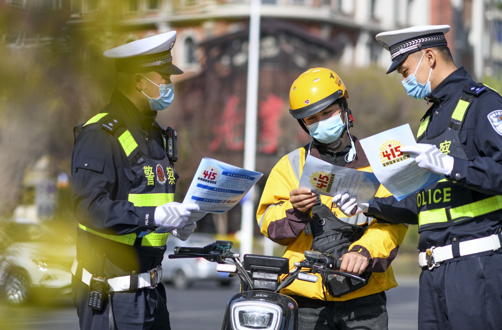 4月14日,在新疆乌鲁木齐市劳动街路口处,乌鲁木齐市公安局交通警察支队特勤大队民警向外卖骑手发放宣传手册。新华社记者 王菲 摄