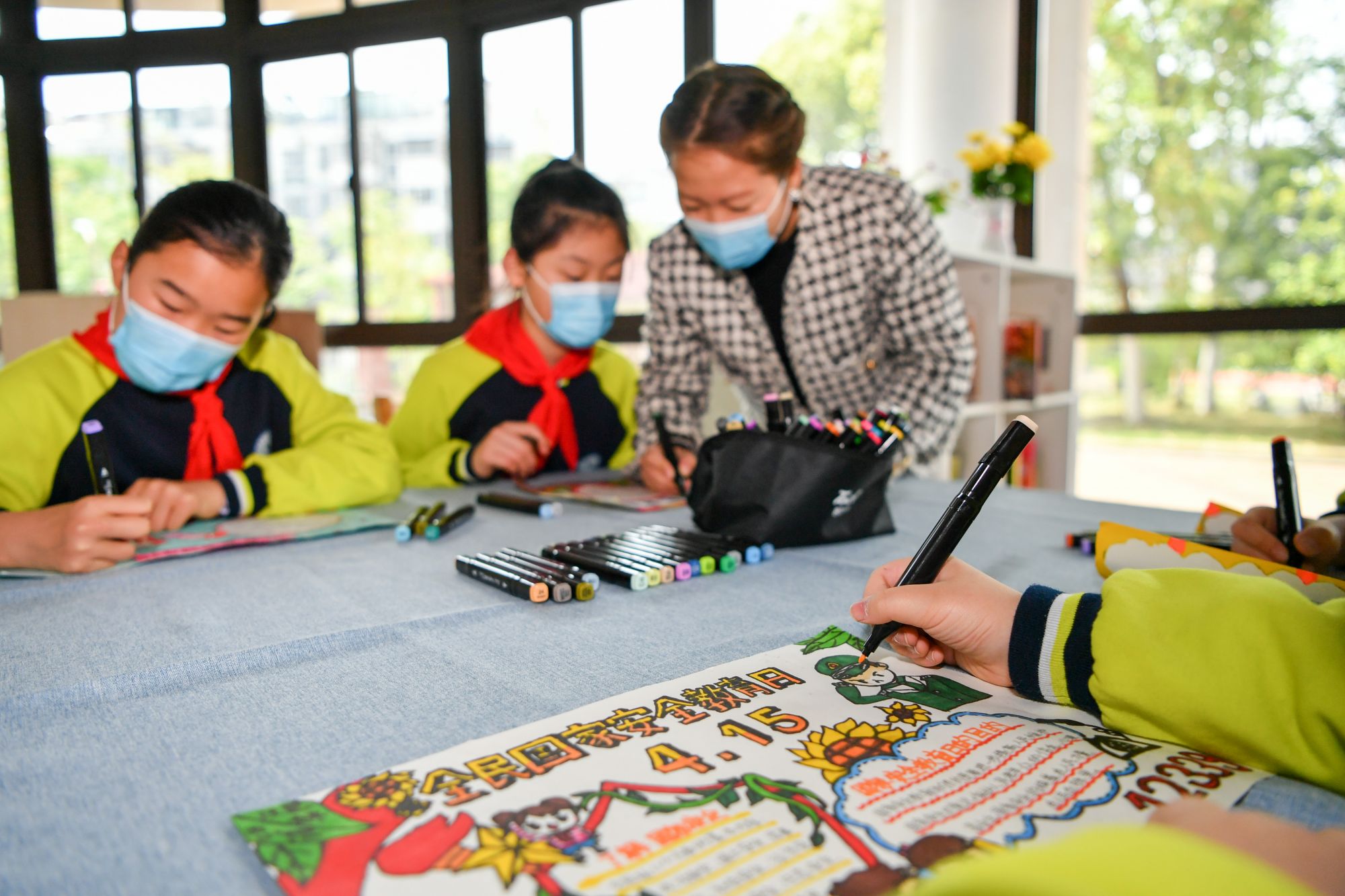4月14日,安徽省合肥市六安路小学翠微分校美术教师刘婷婷指导同学们制作“4.15全民国家安全教育日”手抄报。新华社发(吴小黎 摄)