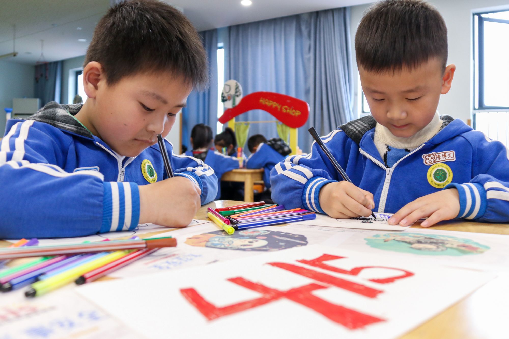 4月14日,浙江省湖州市长兴县水口乡中心幼儿园的孩子们创作国家安全教育主题绘画。新华社发(谭云俸 摄)