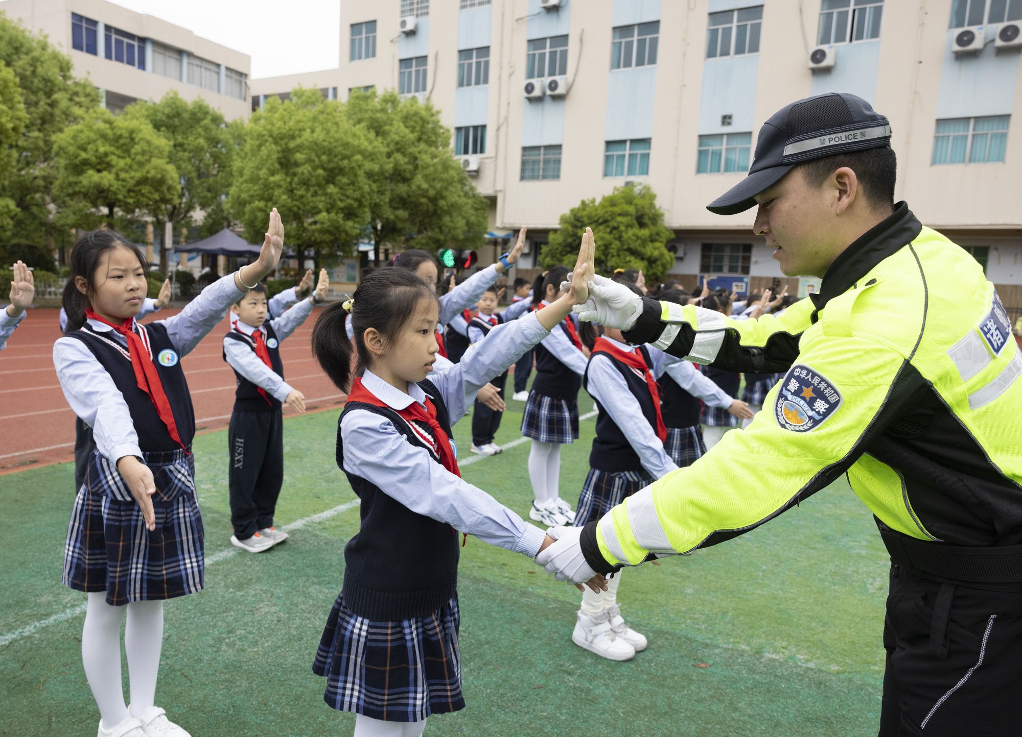 4月14日,浙江省诸暨市公安局的民警在浣纱小学指导学生学习交通指挥手势。新华社发(郭斌 摄)