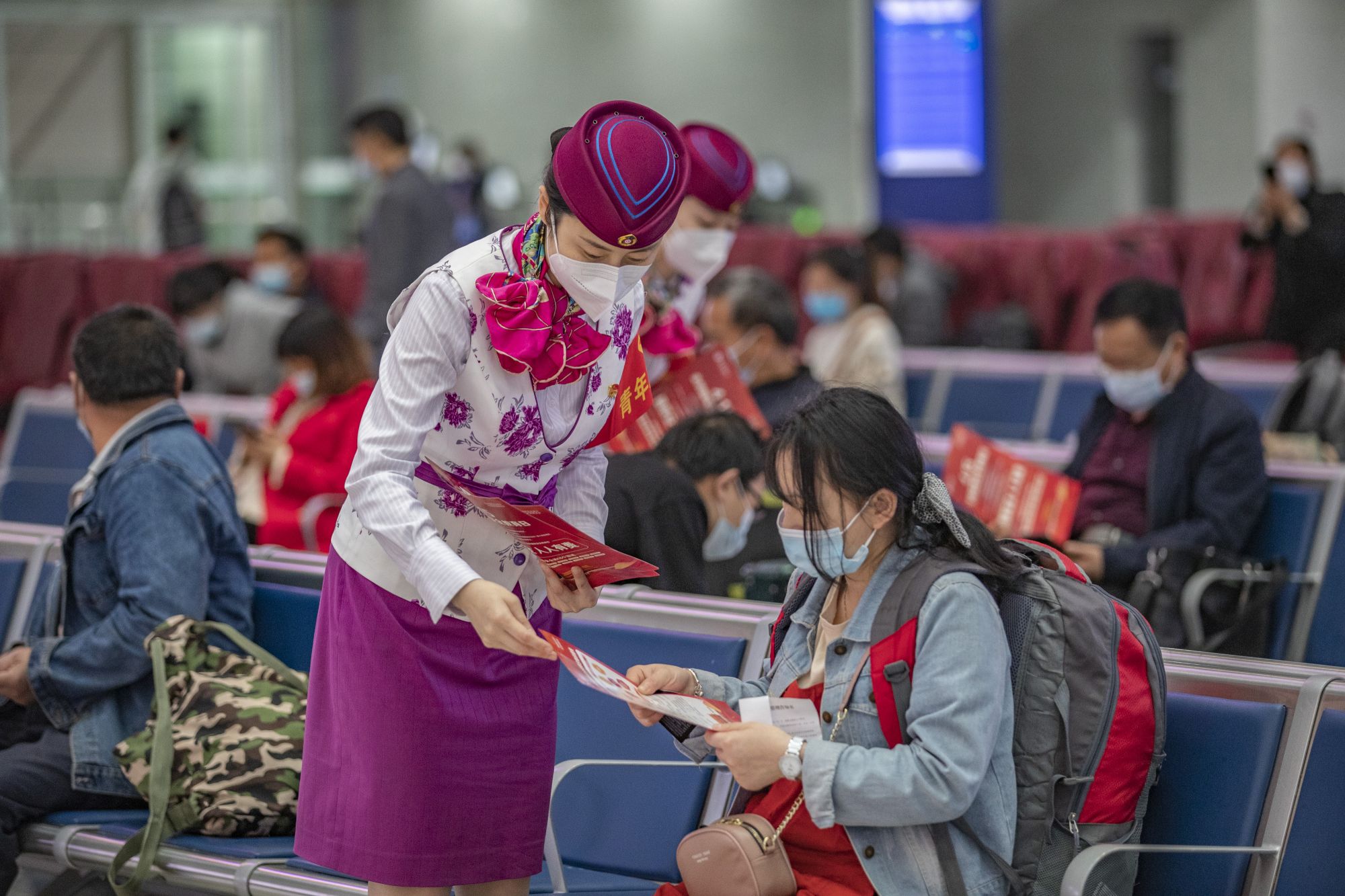 4月14日,在重庆北站候车大厅,中国铁路成都局集团有限公司重庆客运段青年职工志愿者为旅客发放国家安全日宣传单。