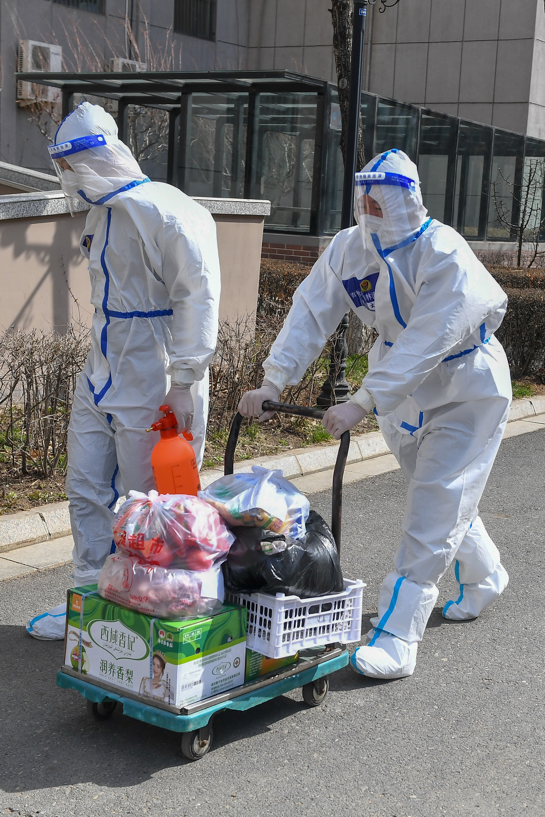 4月8日,在吉林市丰满区中环滨江花园小区,吉林市森林消防支队队员为居民送生活物资。新华社记者张楠摄