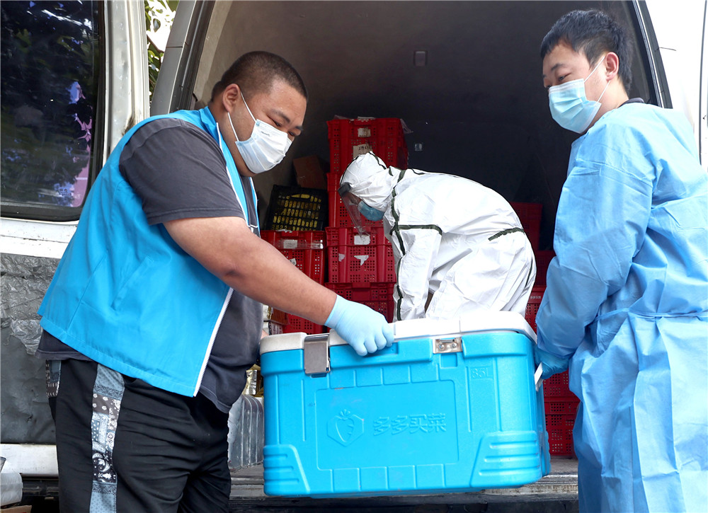 4月17日,李晓俊(左)与志愿者在闵行区虹梅景苑二街坊卸货。新华社记者 陈建力 摄