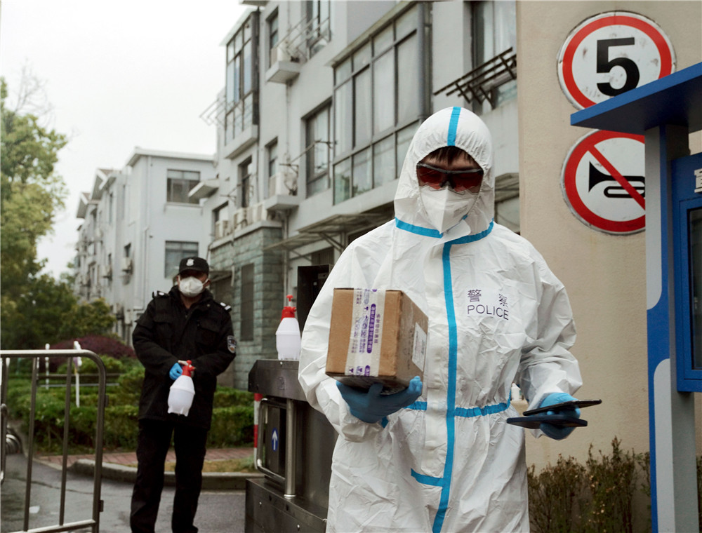 4月16日,上海市公安局经侦总队增援北蔡派出所民警为辖区内一名癌症患者取送抗癌药物。新华社发