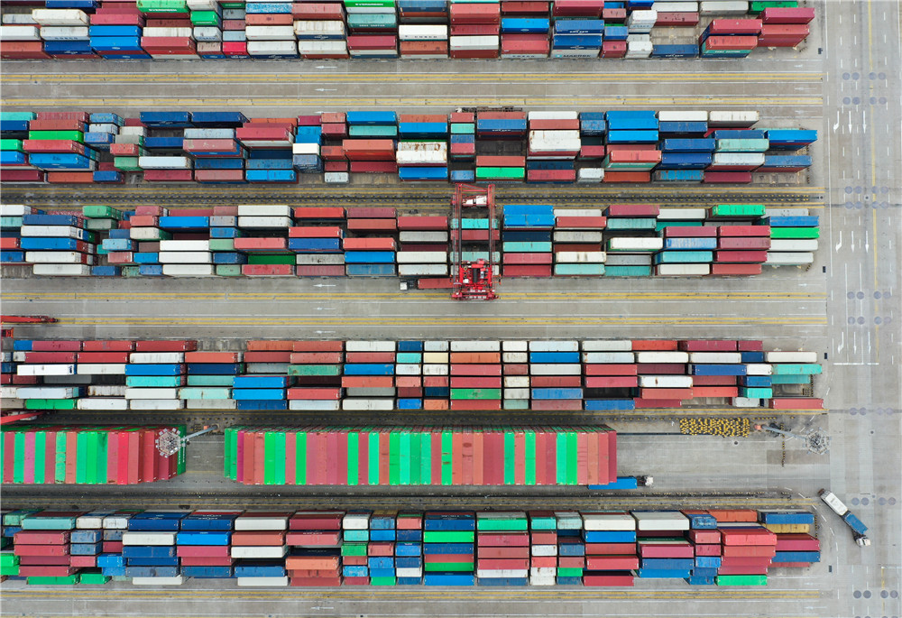 这是4月15日拍摄的上海洋山港集装箱码头(无人机照片)。新华社记者 丁汀 摄