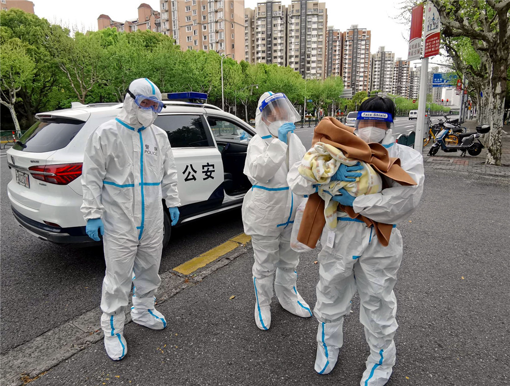 4月16日,上海市公安局经侦总队增援北蔡派出所民警护送患儿和家属前往上海儿童医学中心进行救治。新华社发