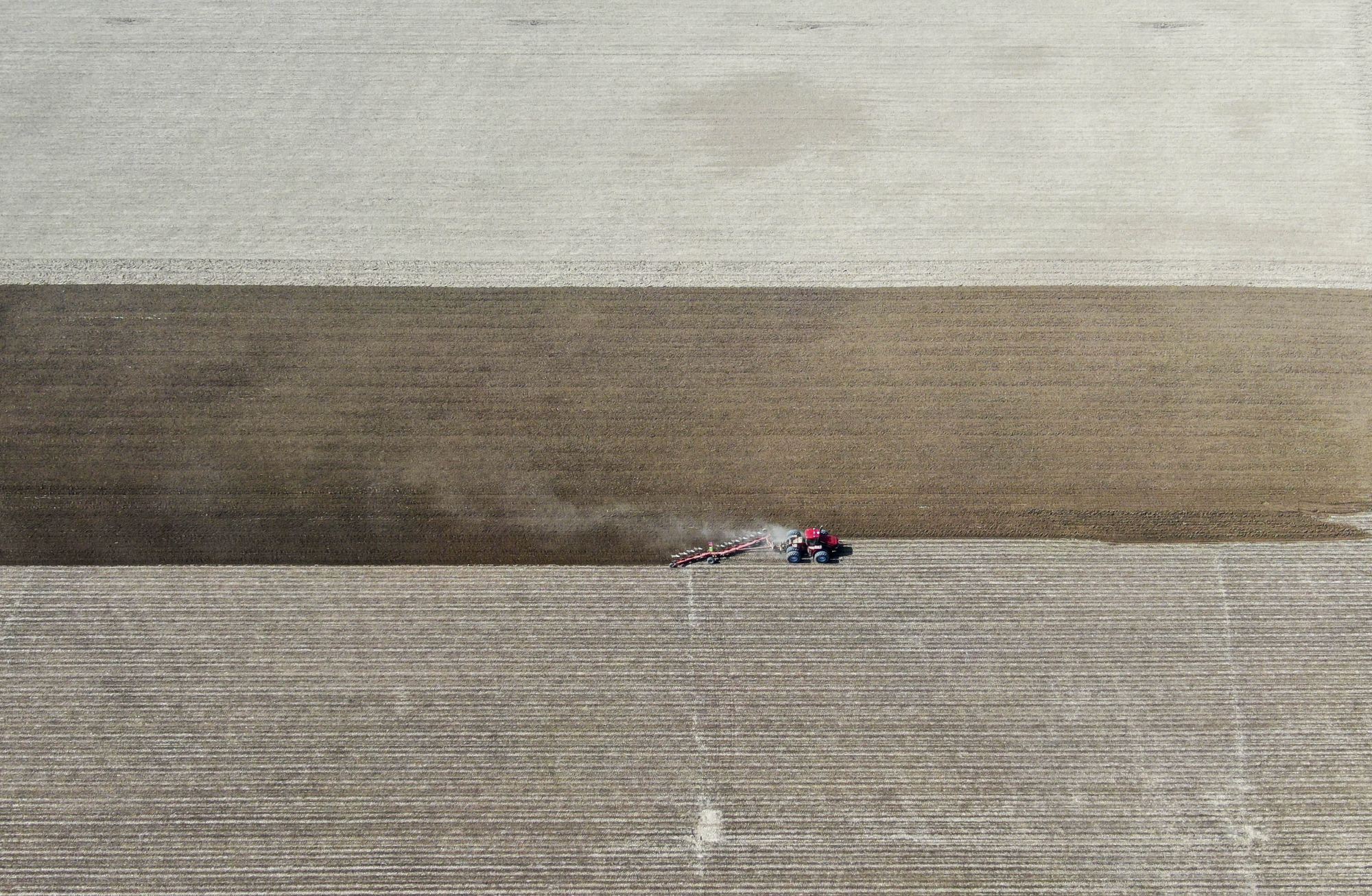 在新疆沙湾市一处棉田里,农民驾驶拖拉机犁地。新华社记者 赵戈 摄