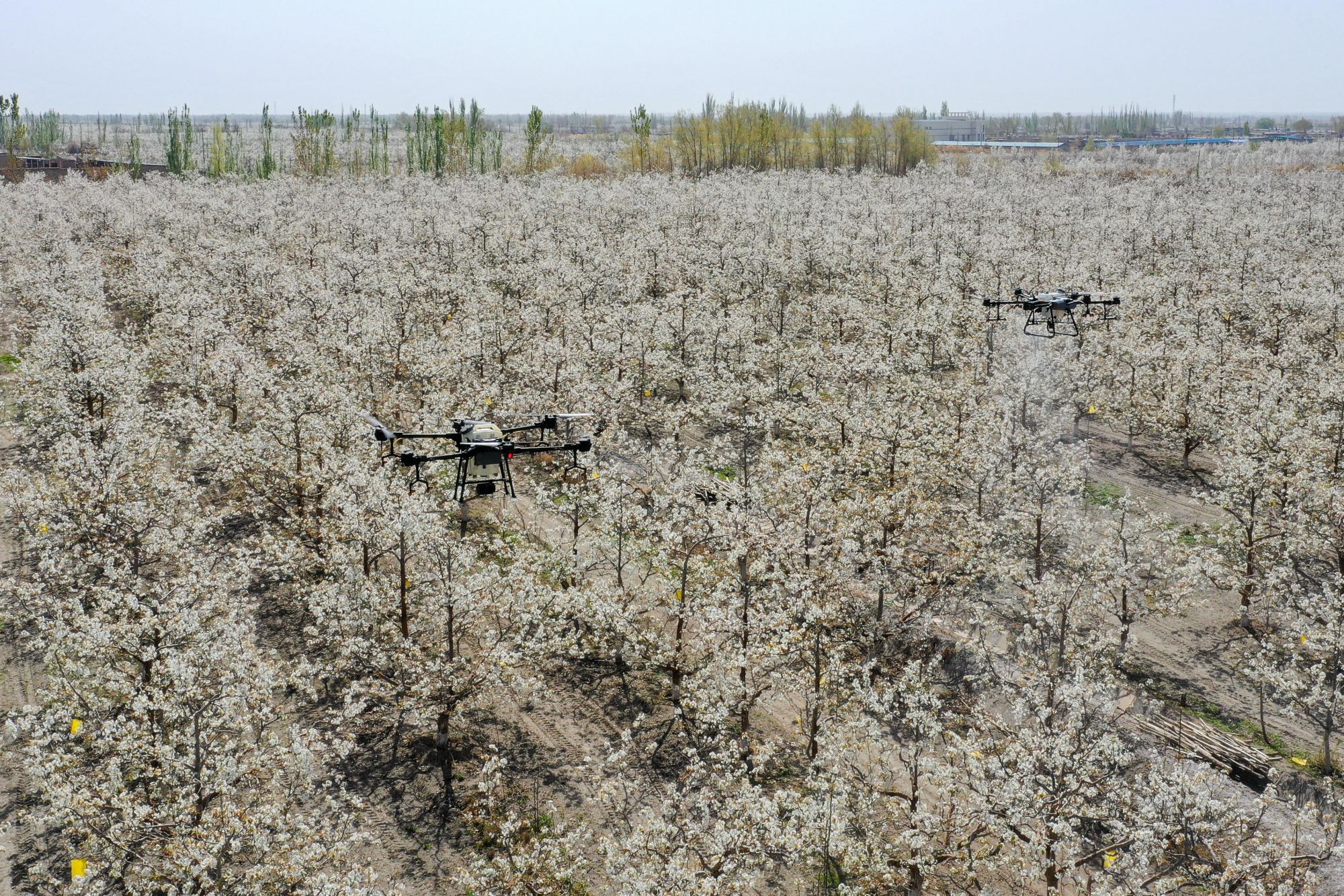 在铁门关市一处香梨示范园,植保无人机进行授粉作业(无人机照片)。(新华社记者 丁磊 摄)