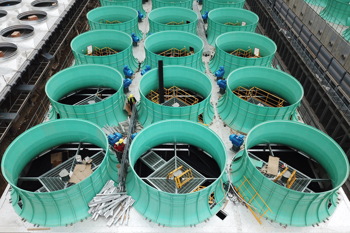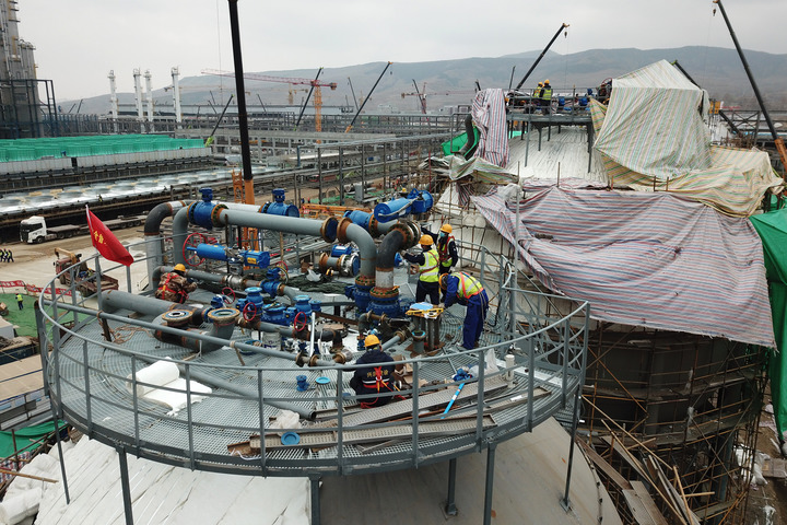 4月16日,在西宁经济技术开发区南川工业园区的青海丽豪20万吨高纯多晶硅项目一期建设现场,工人施工作业中(无人机照片)。