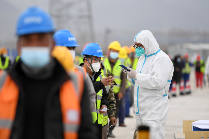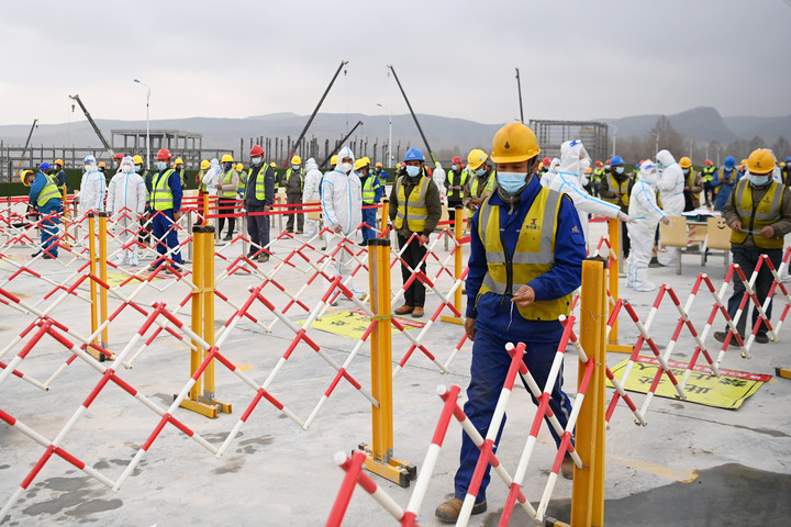 “大家前后间隔两米,采样完后不要逗留,立即返回各自岗位。”公司疫情防控办公室主任田永生手拿喇叭在现场维持秩序。田永生说,建设工人来自五湖四海,进场必须测温扫码,每天报告行动轨迹,分时分工段进行核酸检测,项目提前储备3个月用量的物资,确保各个工序不间断,整个项目不停工。