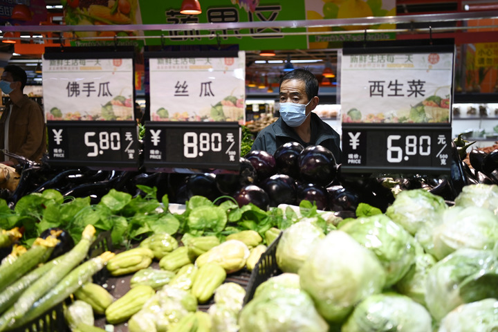 4月18日,在西宁大十字百货商店有限公司广场店,市民选购蔬菜。