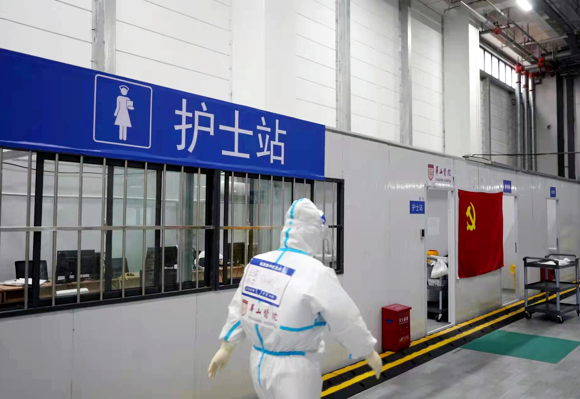 4月16日,临港方舱医院里,一名医护人员走过护士站。新华每日电讯记者杨有宗摄