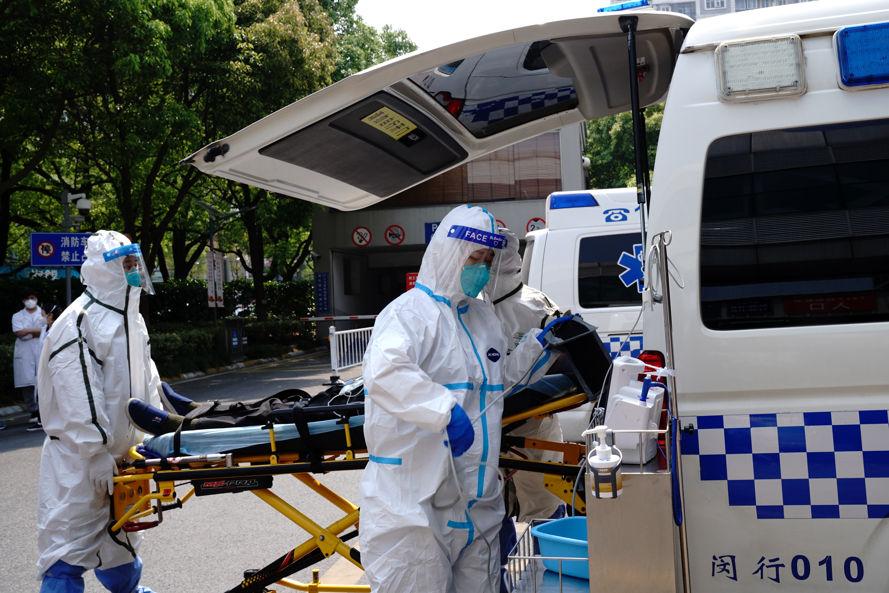 4月20日,在复旦大学附属闵行医院,医护人员接收120急救车转运来的一位患者。新华社记者 张建松 摄