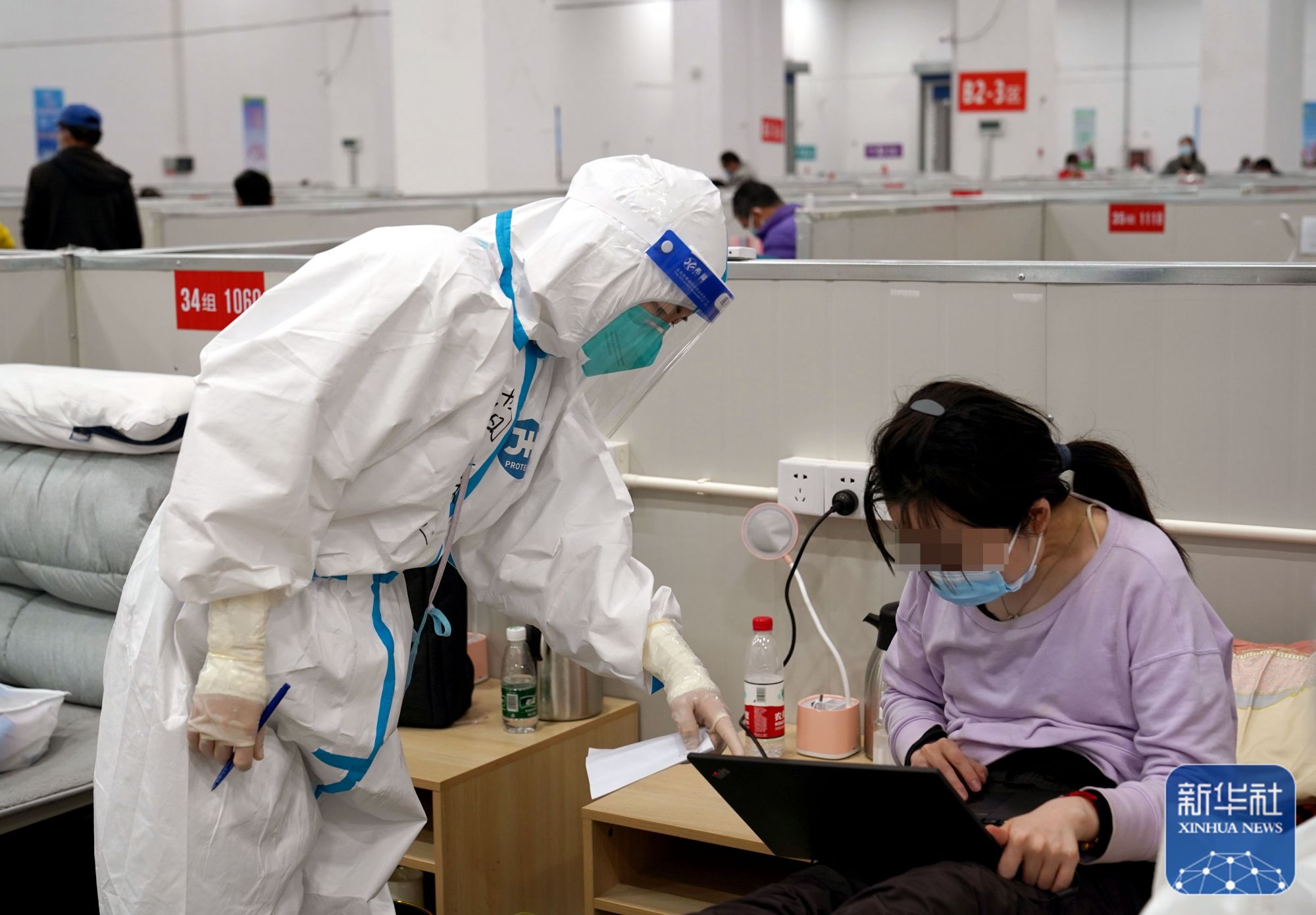 ↑4月21日,临港方舱医院内的医护人员与患者交流。