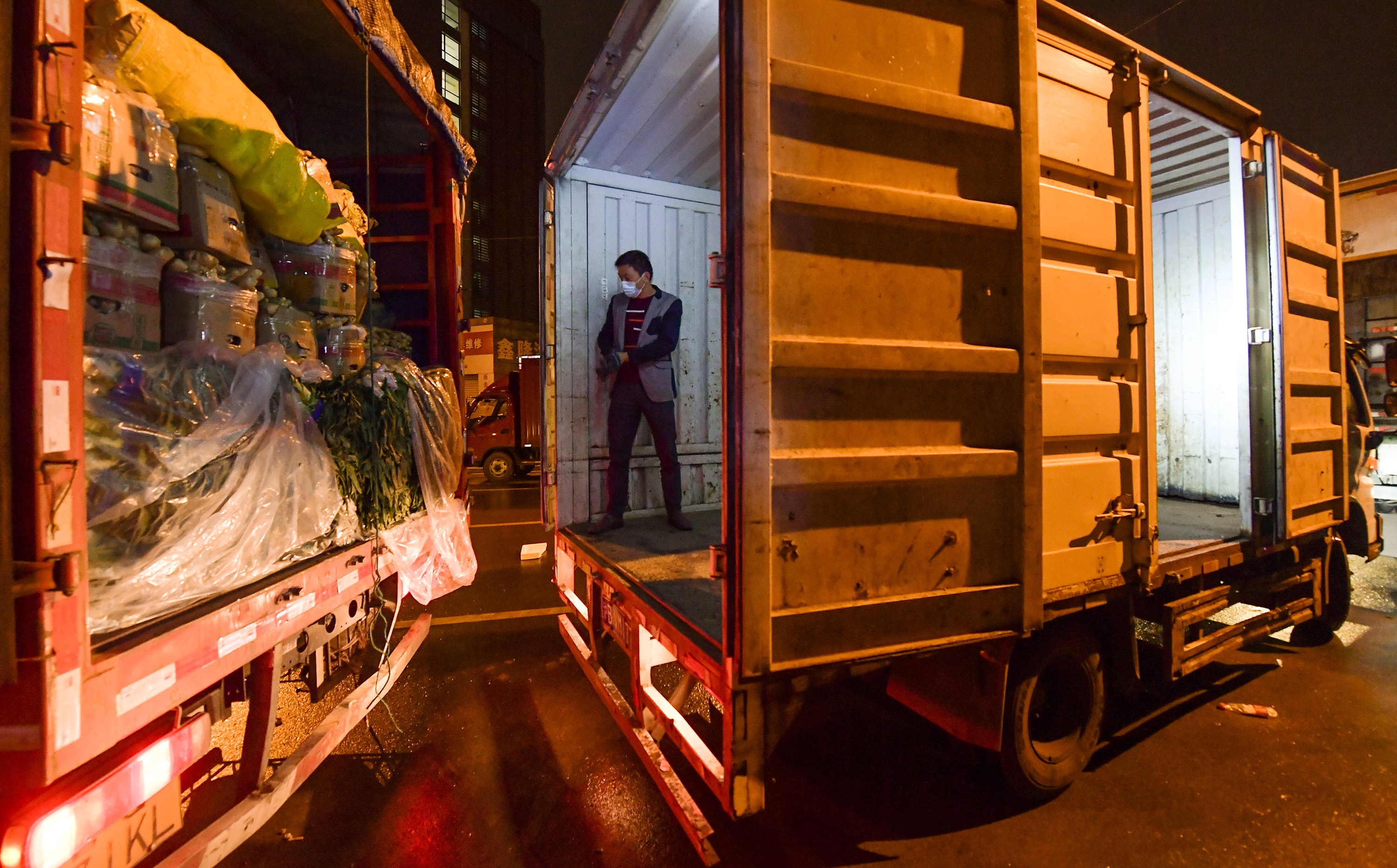 4月23日凌晨,杜凤洋驾驶的大货车(左)在上海青浦区华雅路卸货点等来分销商的货车,即将分货。新华社记者 李贺 摄